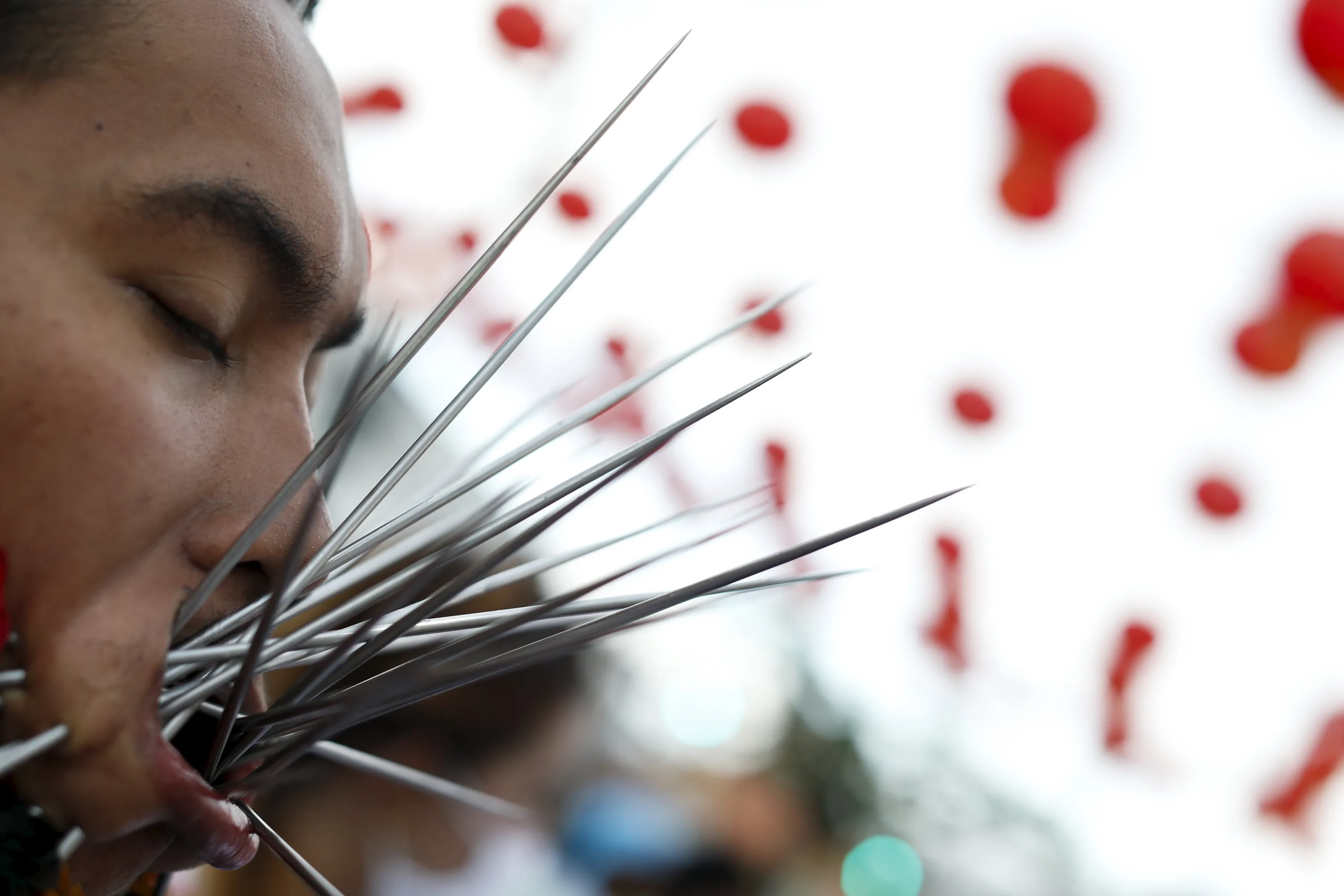 A devotee of the Chinese Bang Neow shrine with spikes pierced in his cheeks, pauses during a procession celebrating the annual vegetarian festival in Phuket, Thailand October 18, 2015. (Photo by Jorge Silva/Reuters)