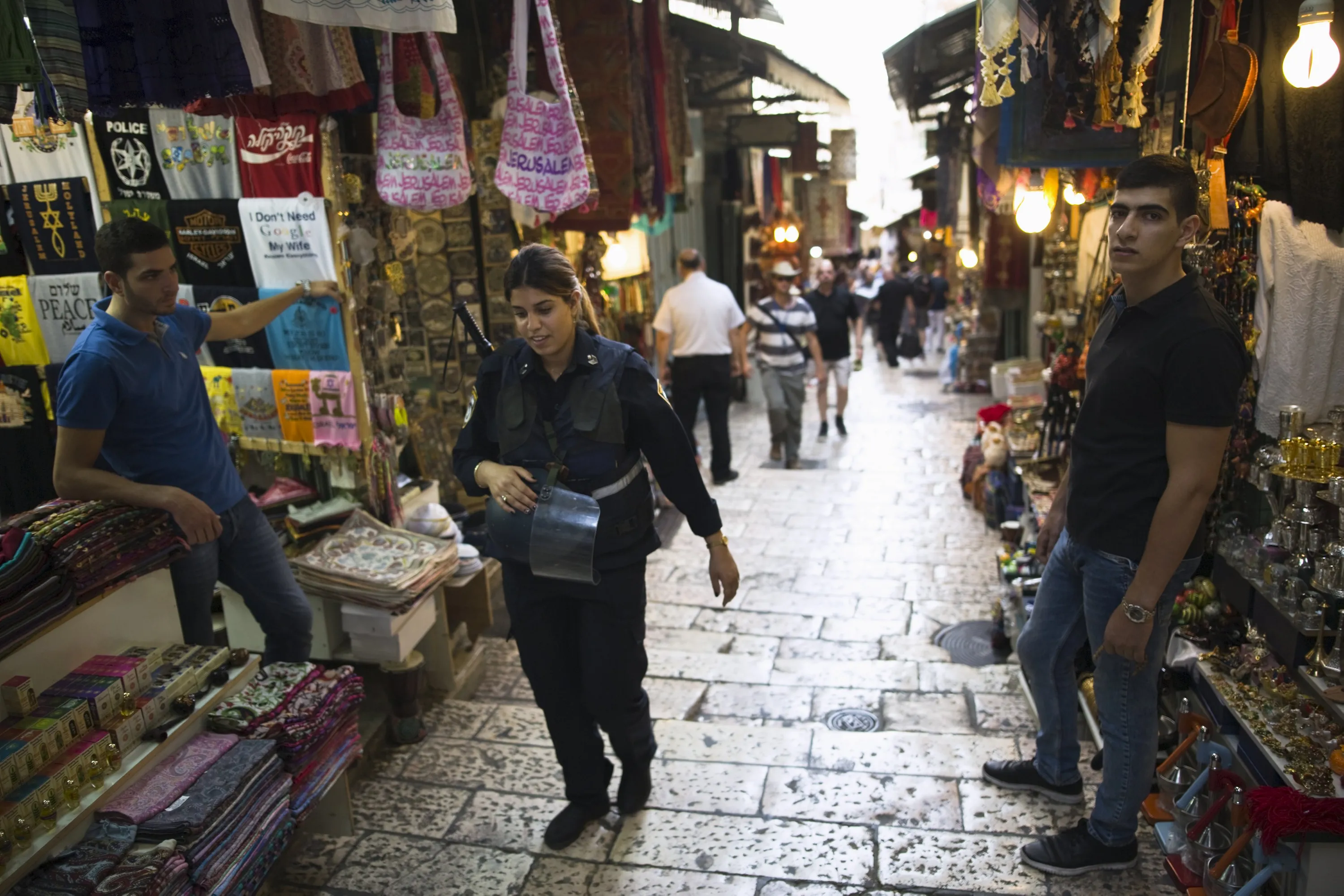An Israeli police officer (C) walks past vendors in Jerusalem's Old City October 18, 2015. A surge in Palestinian attacks in Israel is raising concerns that the weakening economy could eventually be pushed into recession. Picture taken October 18, 2015. (Photo by Amir Cohen/Reuters)