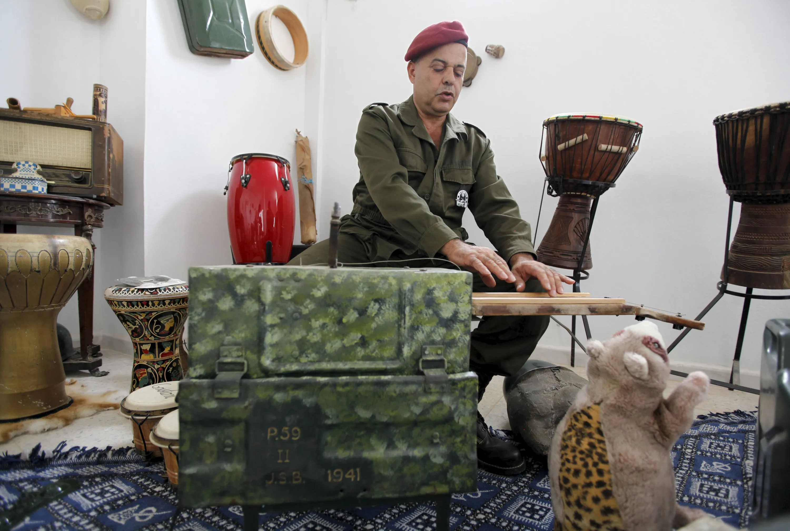 Tunisian Army retiree Belgacem Majri plays music using homemade musical instruments that he built using arms such as bombs and missiles, in Tunis, Tunisia October 20, 2015. (Photo by Anis Mili/Reuters)