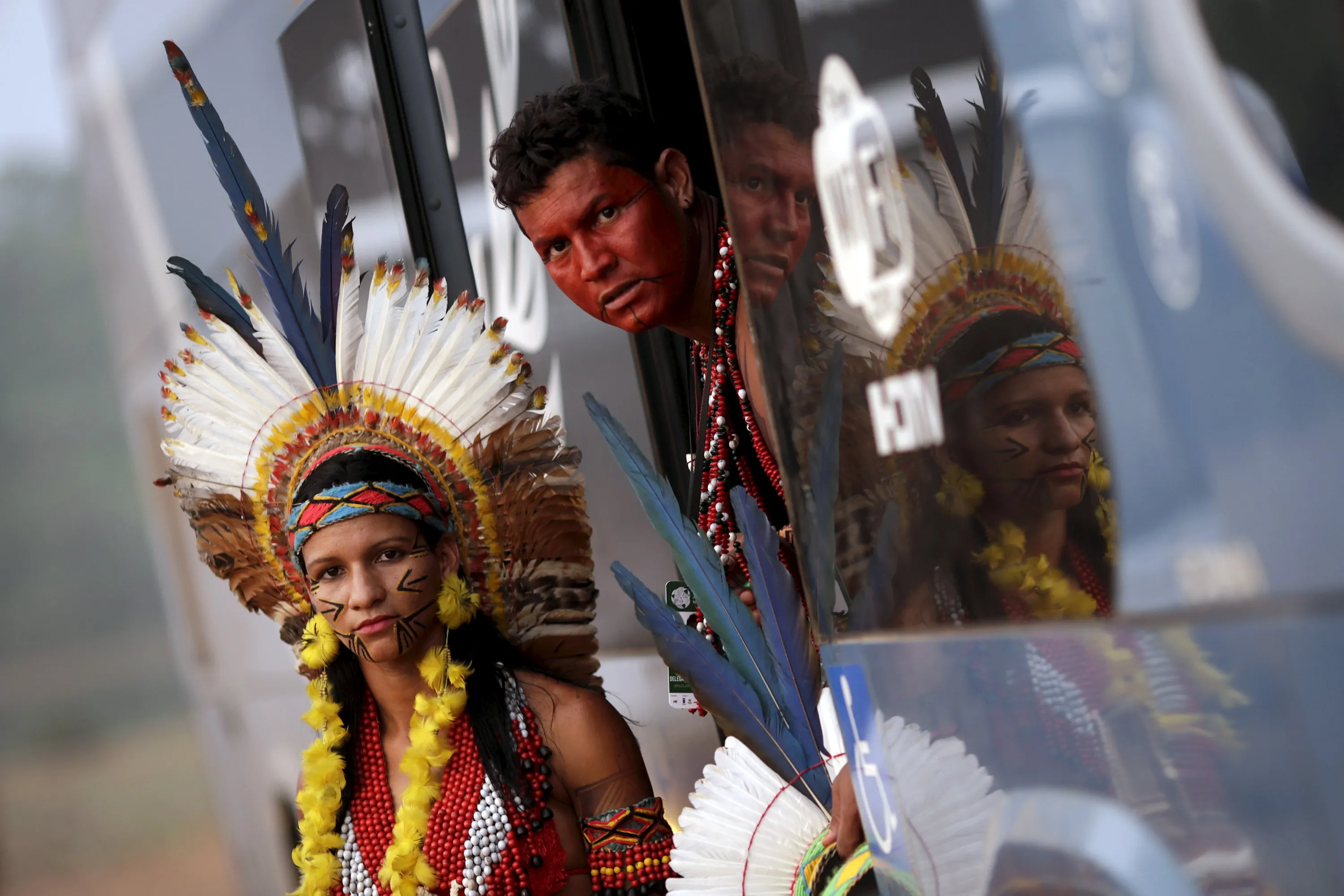 Indigenous people from the Pataxo tribe look out of a bus as they arrive to participate in the I World Games for Indigenous People in Palmas, Brazil, October 20, 2015. (Photo by Ueslei Marcelino/Reuters)