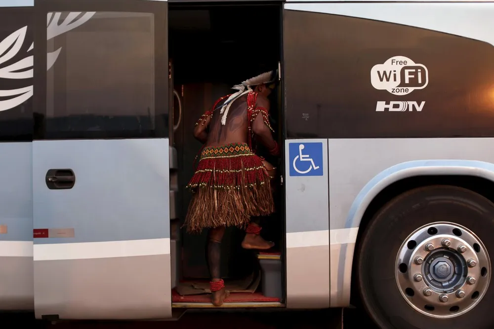 A indigenous man from the Pataxo tribe enters a bus after arriving to participate in the I World Games for Indigenous People in Palmas, Brazil, October 20, 2015. (Photo by Ueslei Marcelino/Reuters)