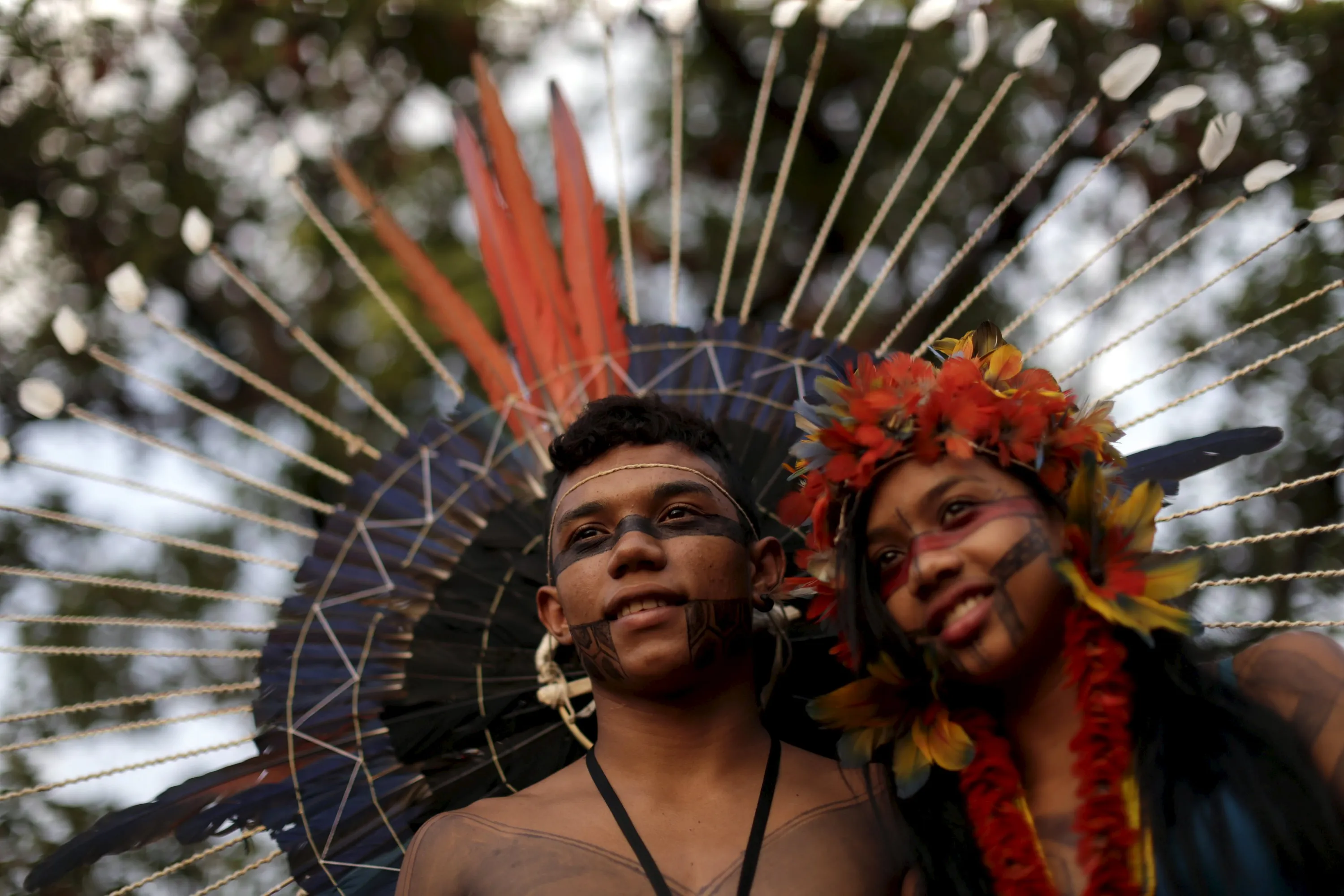 A indigenous man from the Xambioa tribe poses for photos with an indigenous girl from the Pataxo tribe as they arrive to participate in the I World Games for Indigenous People in Palmas, Brazil, October 20, 2015. (Photo by Ueslei Marcelino/Reuters)