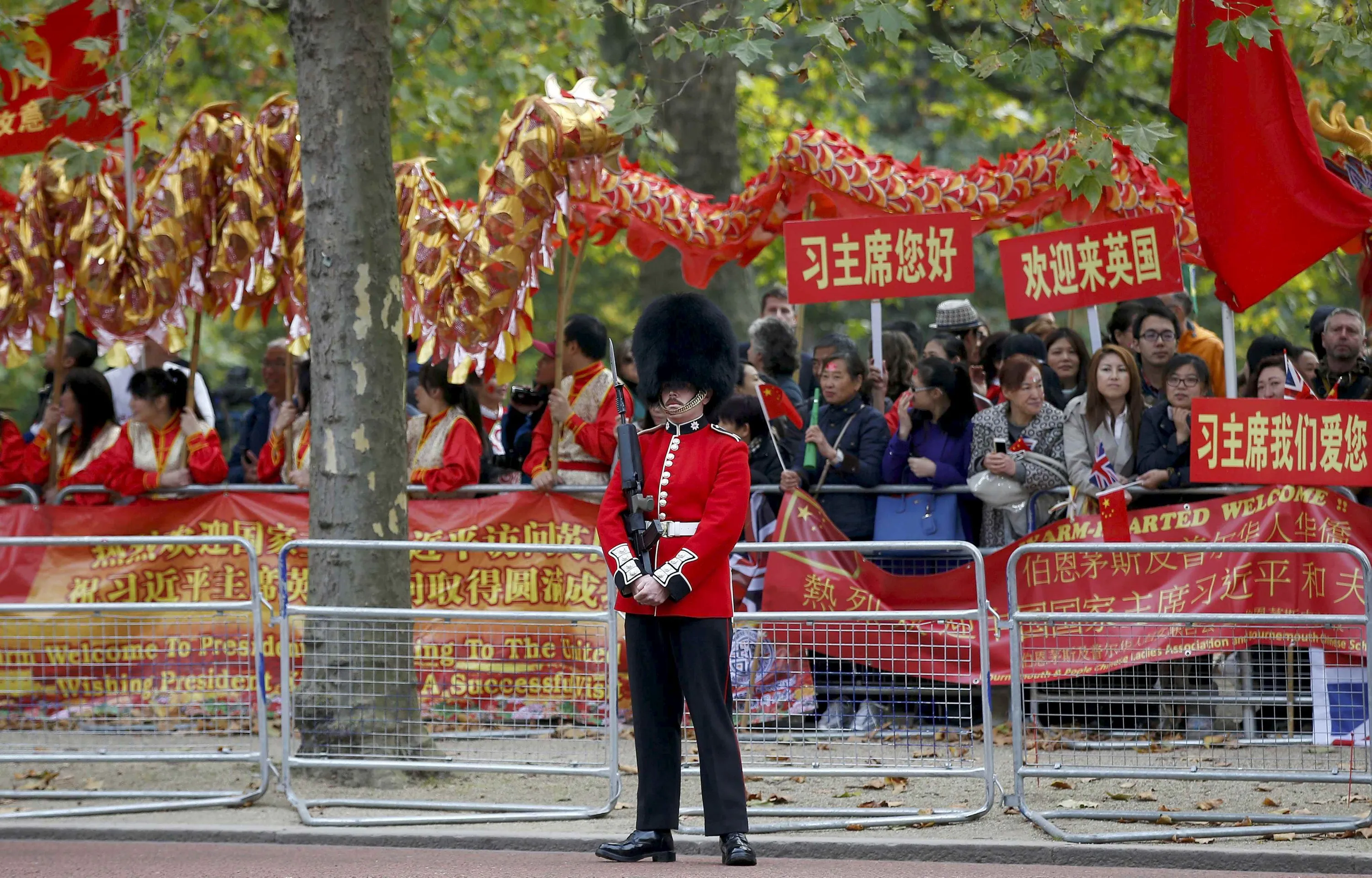 A guardsman stands on duty in front of supporters of China's President Xi Jinping as they wait on the Mall for him to pass during his ceremonial welcome, in London, Britain, October 20, 2015. (Photo by Peter Nicholls/Reuters)