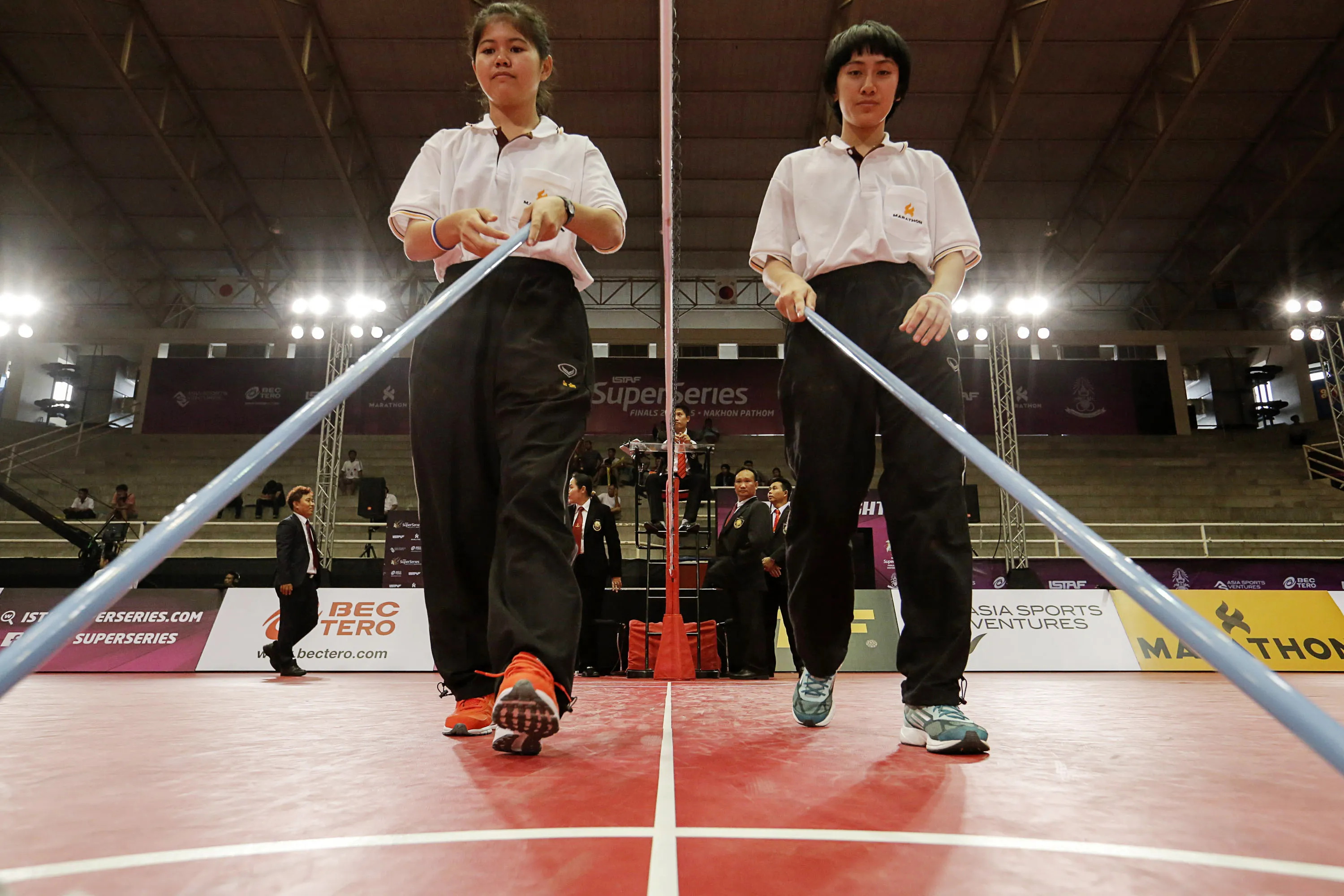 Sepak Takraw, ISTAF Super Series Finals Thailand 2014/2015, Nakhon Pathom Municipal Gymnasium, Huyjorake Maung, Nakonprathom, Thailand on October 20, 2015: Ballads clean the court during a time out in Malaysia and Thailand's group stage match. (Photo by Asia Sports Ventures/Action Images via Reuters)