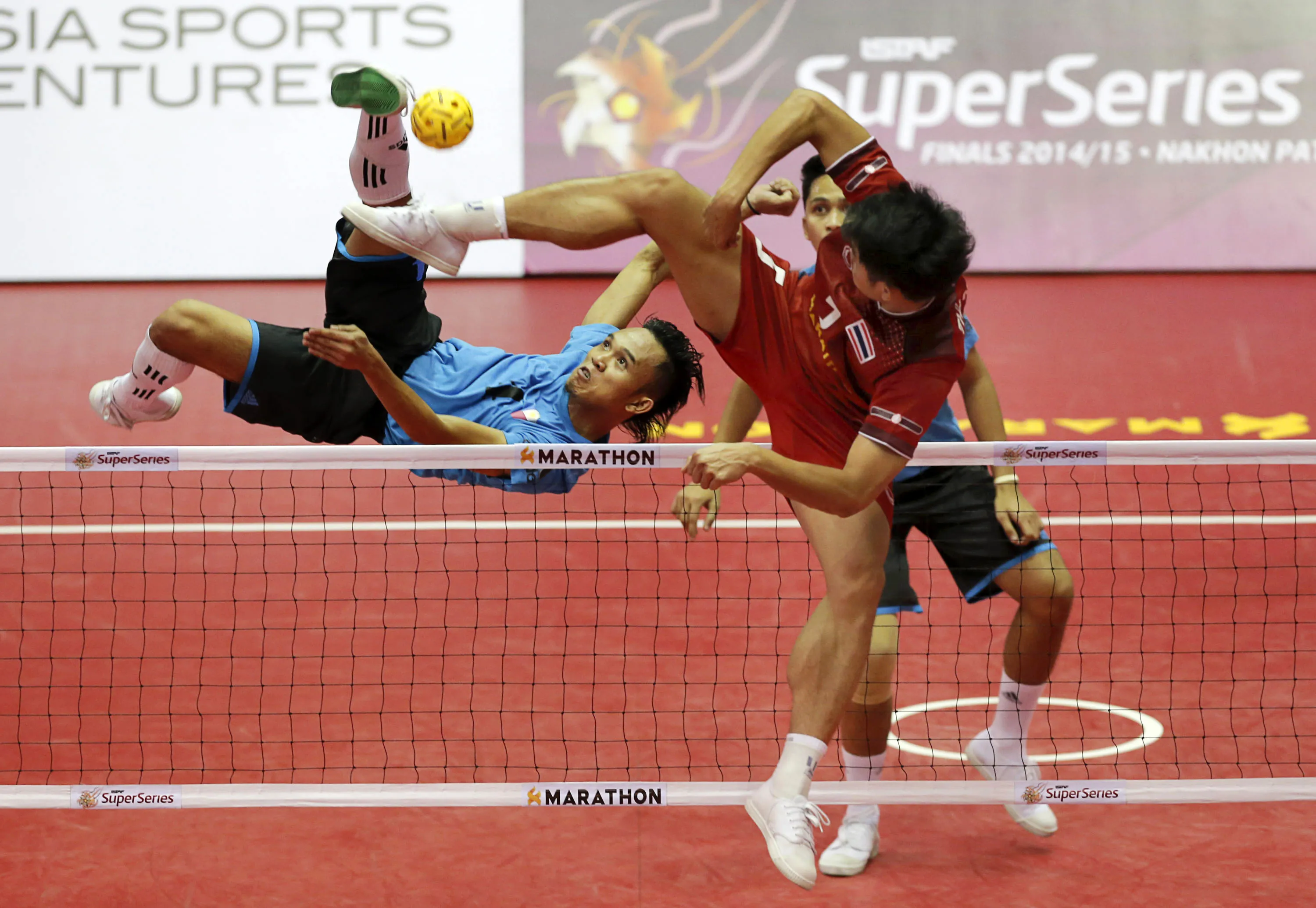 Sepak Takraw, ISTAF Super Series Finals Thailand 2014/2015, Nakhon Pathom Municipal Gymnasium, Huyjorake Maung, Nakonprathom, Thailand on October 21, 2015: Thailand's Thawisak Thongsai (front) and The Philippines' Rhey Jey Ortuste in action during their group stage match. (Photo by Asia Sports Ventures/Action Images via Reuters)
