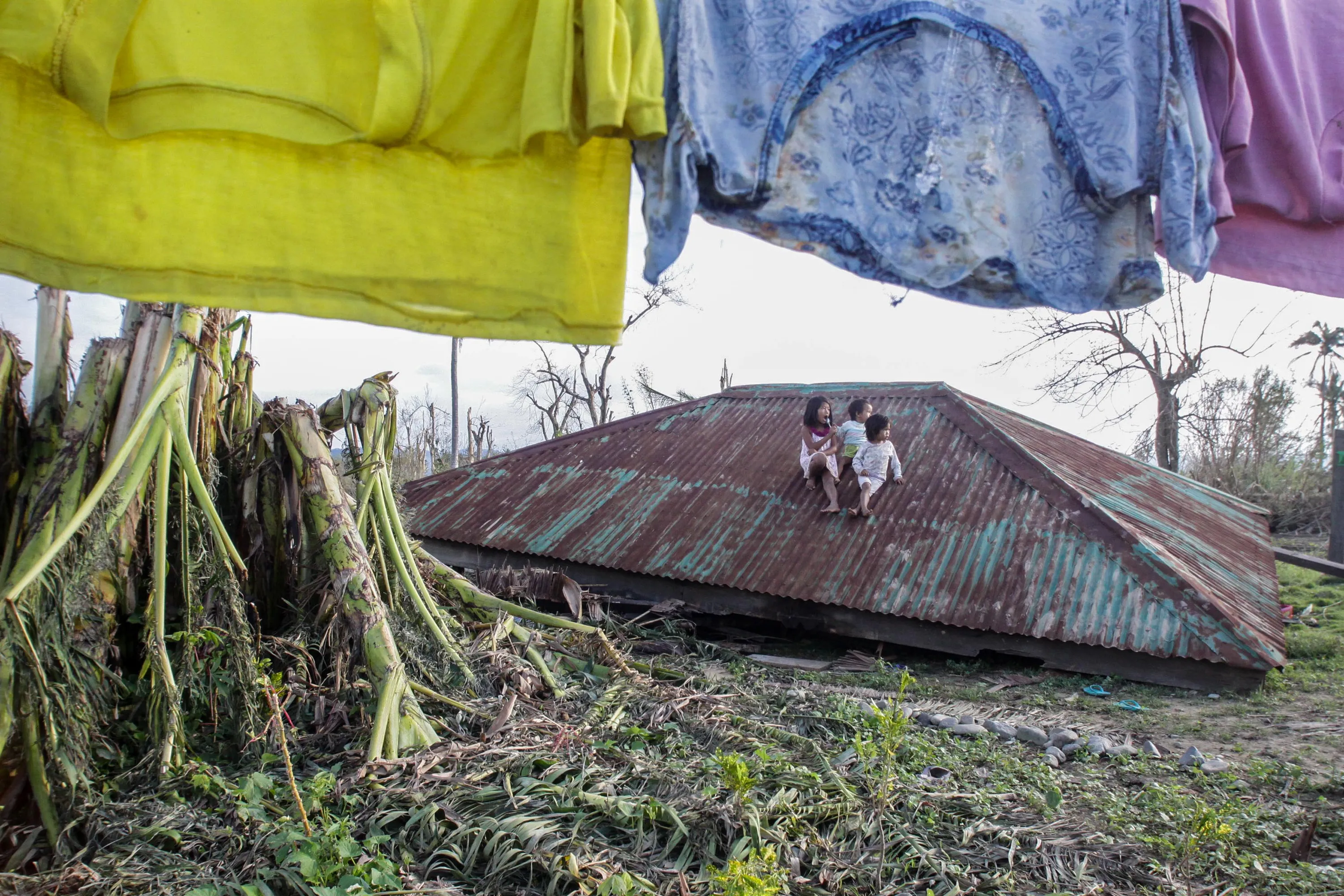 Children sit on the roof of a house blown over by typhoon Koppu in Casiguran town, Auroran province northeast of Manila on October 21, 2015, days after the typhoon devastated the province. Widespread flooding in the Philippines caused by a powerful typhoon eased on October 21 but the storm's death toll climbed to 47 and tens of thousands of people remained in evacuation centres. (Photo by Dante Diosina/AFP Photo)