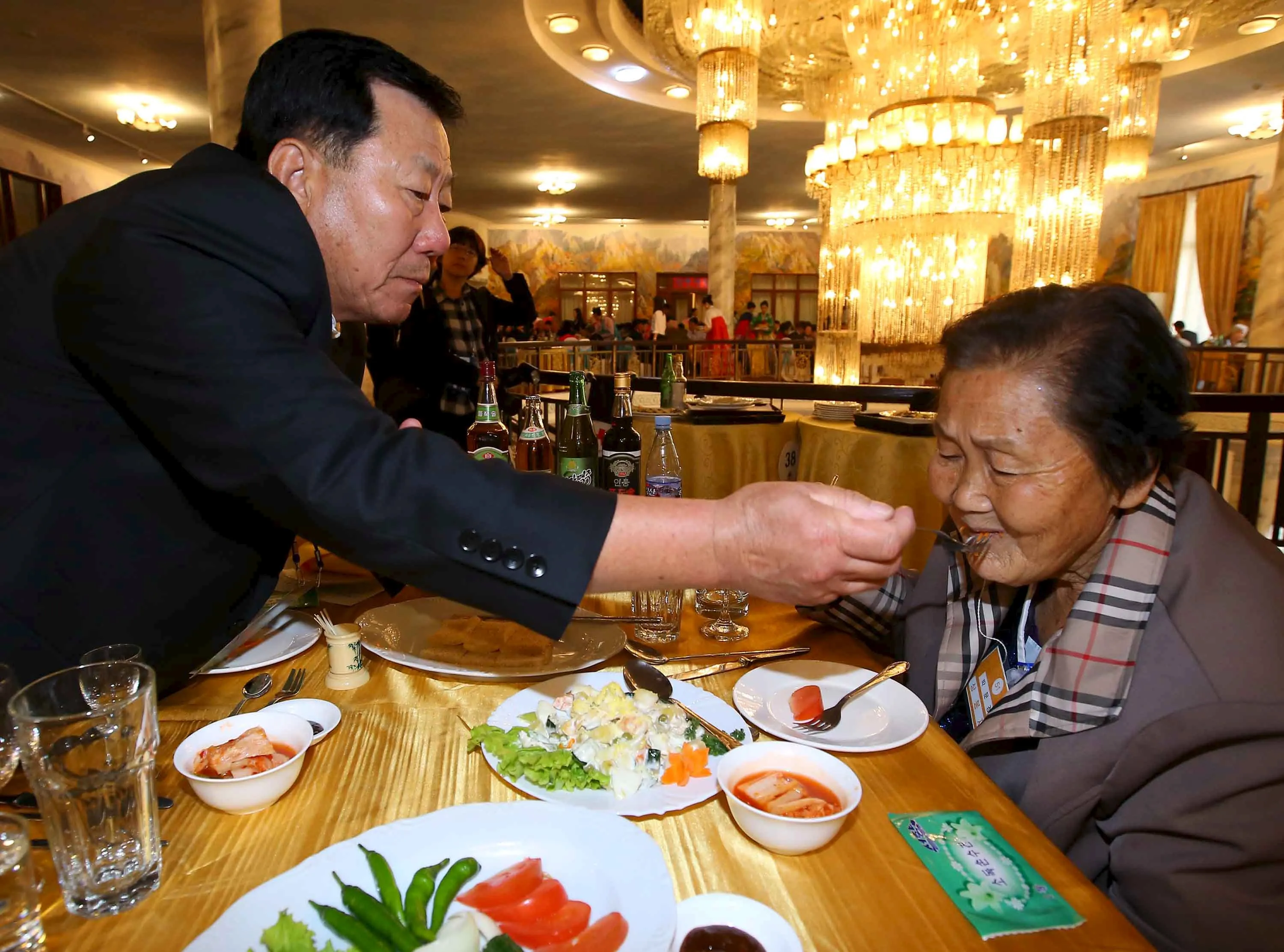 South Korean Park Mun-su (L), 71, feeds his North Kroean sister Park Mun Kyung, 83, at a group luncheon during the separated family reunions at Mount Kumgang resort, North Korea, October 21, 2015. (Photo by Reuters/Yonhap)