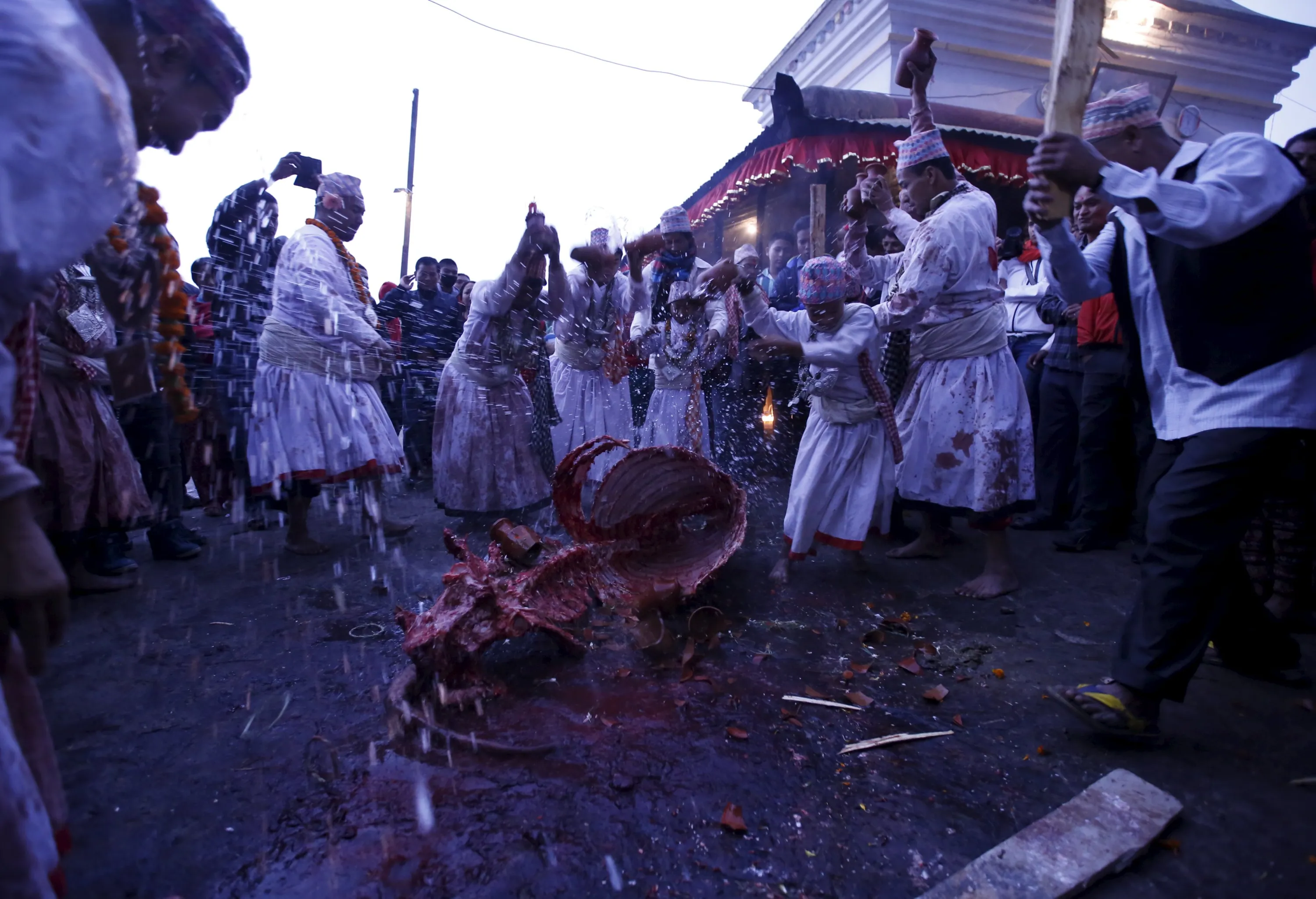 Priests covered in bloodstains perform rituals in front of a buffalo carcass during the sacrificial ceremony held to mark the "Dashain", Hinduism's biggest religious festival in Bhaktapur, Nepal October 22, 2015. (Photo by Navesh Chitrakar/Reuters)