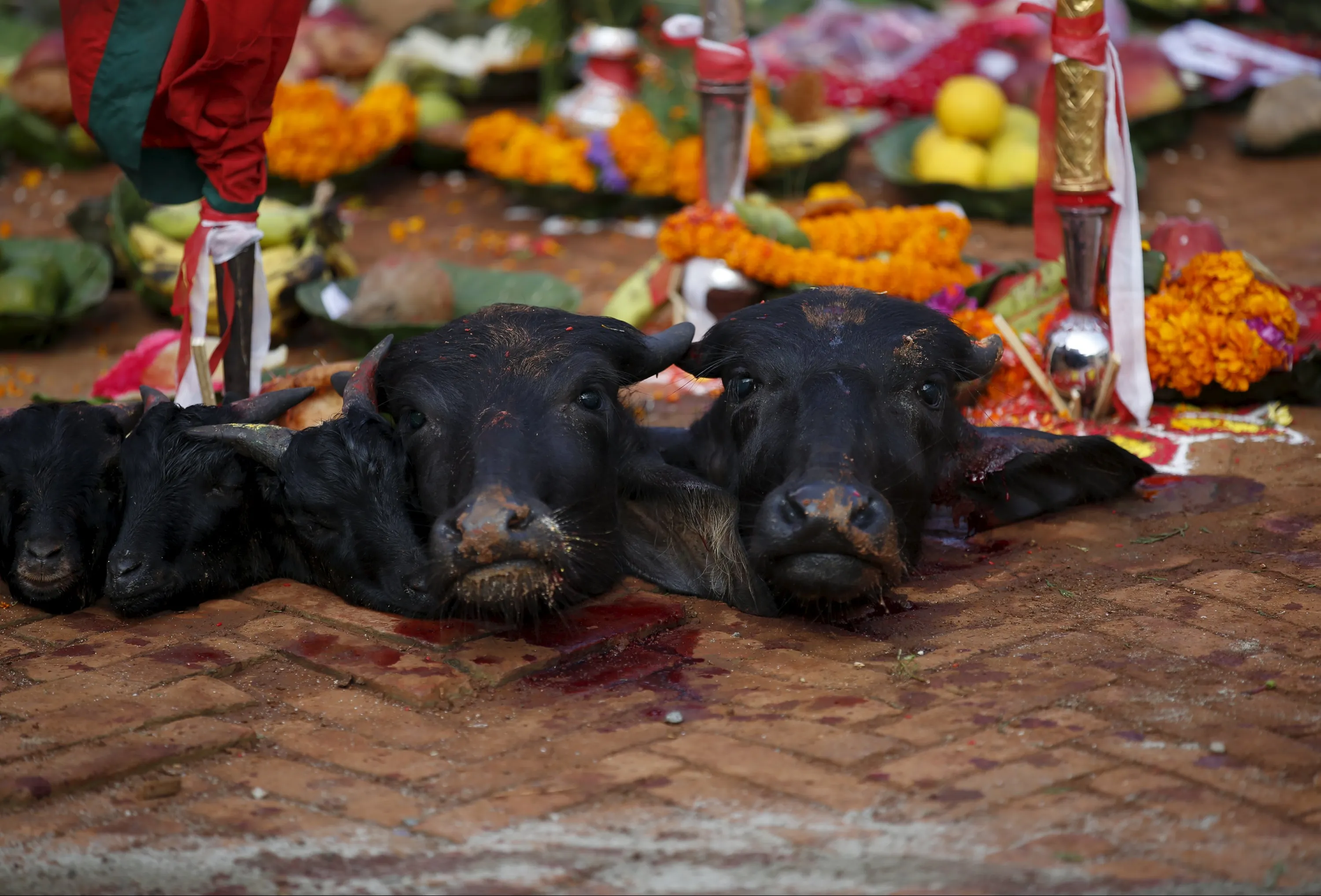 The heads of slaughtered water buffalos and goats are lined up on the ground after the animals were sacrificed to mark the "Dashain", Hinduism's biggest religious festival in Bhaktapur, Nepal, October 22, 2015. (Photo by Navesh Chitrakar/Reuters)