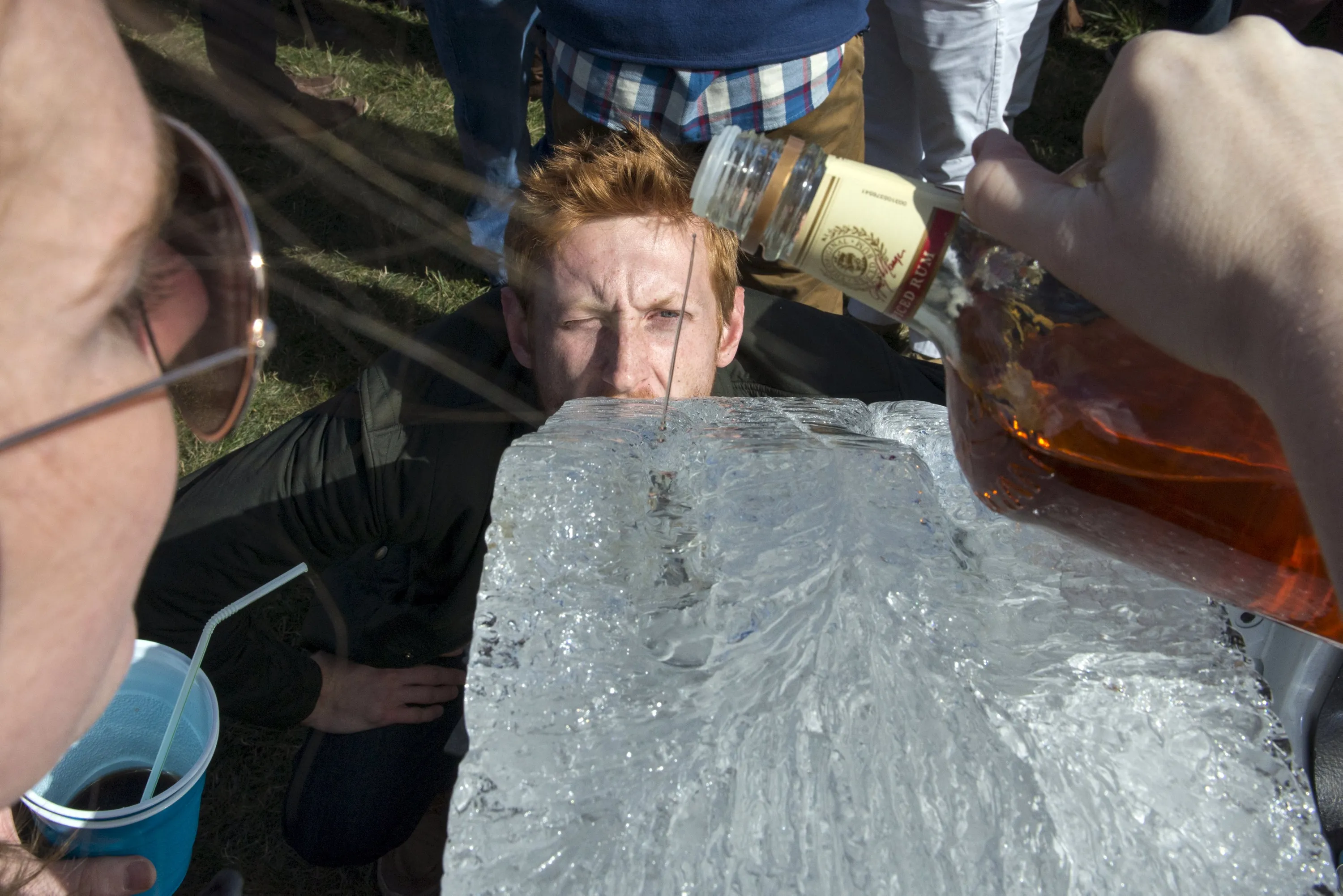 A man drinks alcohol from the bottom of an ice luge while a woman pours the liquor at the Far Hills Race Day at Moorland Farms in Far Hills, New Jersey, October 17, 2015. (Photo by Stephanie Keith/Reuters)