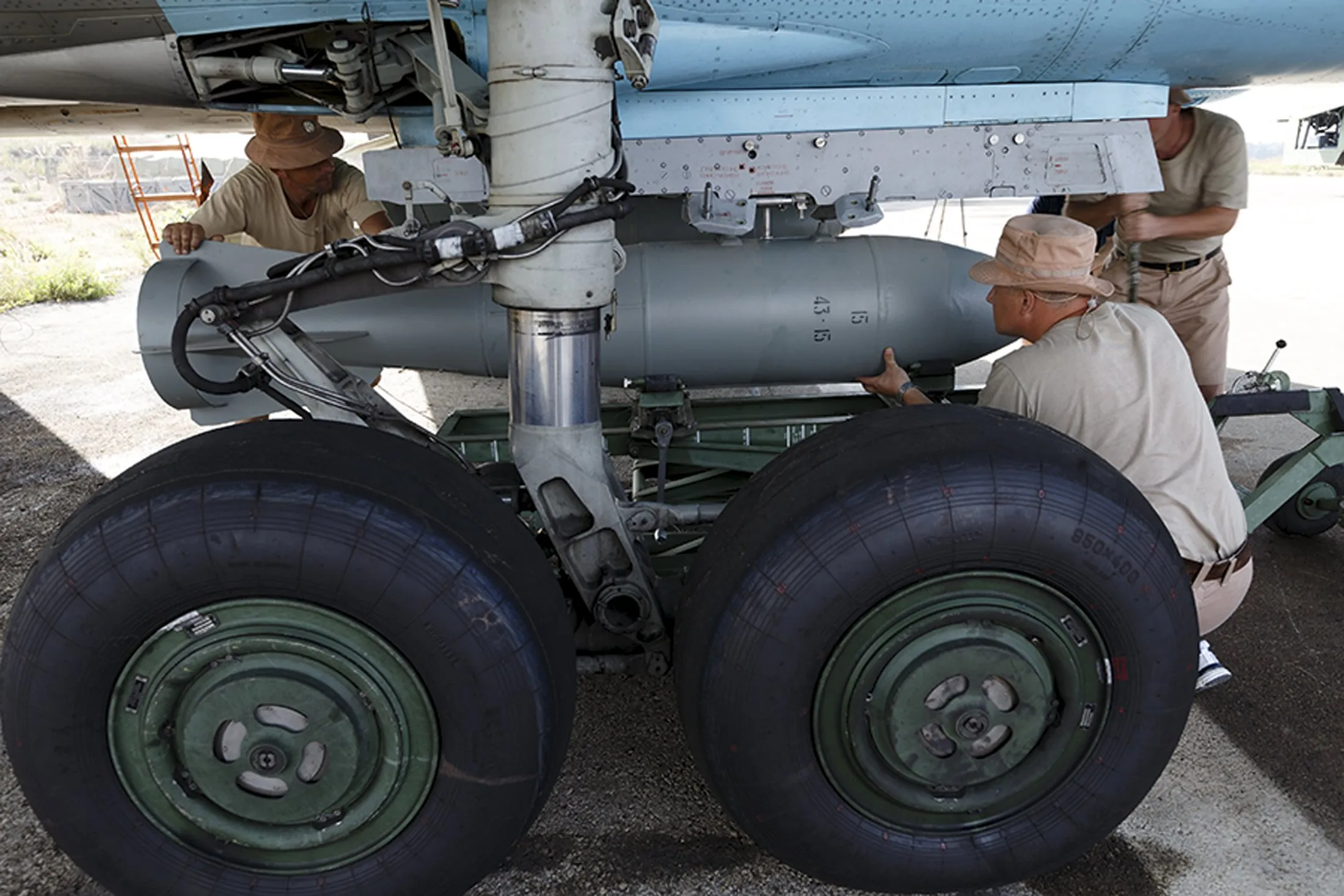 Russian ground staff members load a Sukhoi Su-34 fighter jet with weapons at the Hmeymim air base near Latakia, Syria, in this handout photograph released by Russia's Defence Ministry October 22, 2015. (Photo by Reuters/Ministry of Defence of the Russian Federation)
