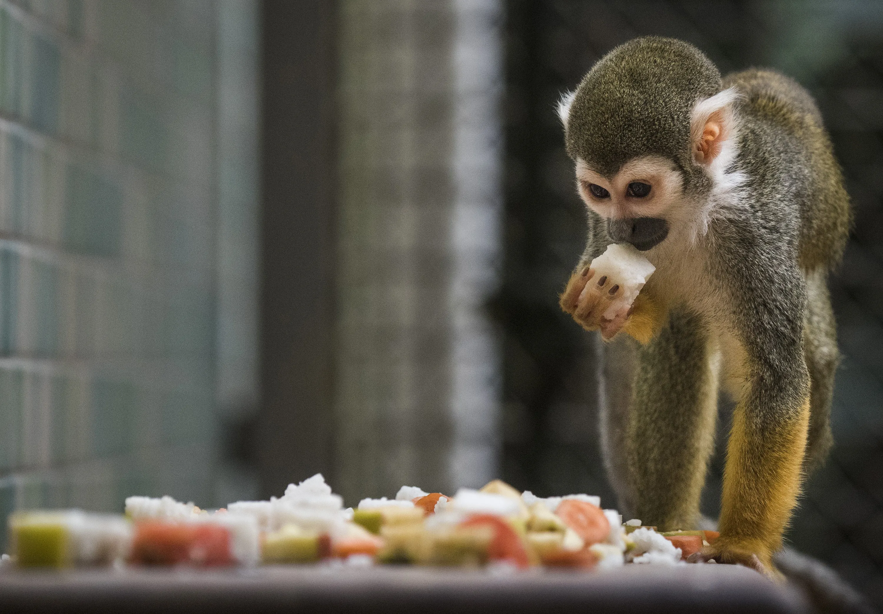 A squirrel monkey eats in its enclosure at the Zoo in Berlin on October 18, 2015. The German capital saw temperatures rising into the double figures with some sun after a week with unseasonal cold weather and rain. (Photo by Odd Andersen/AFP Photo)