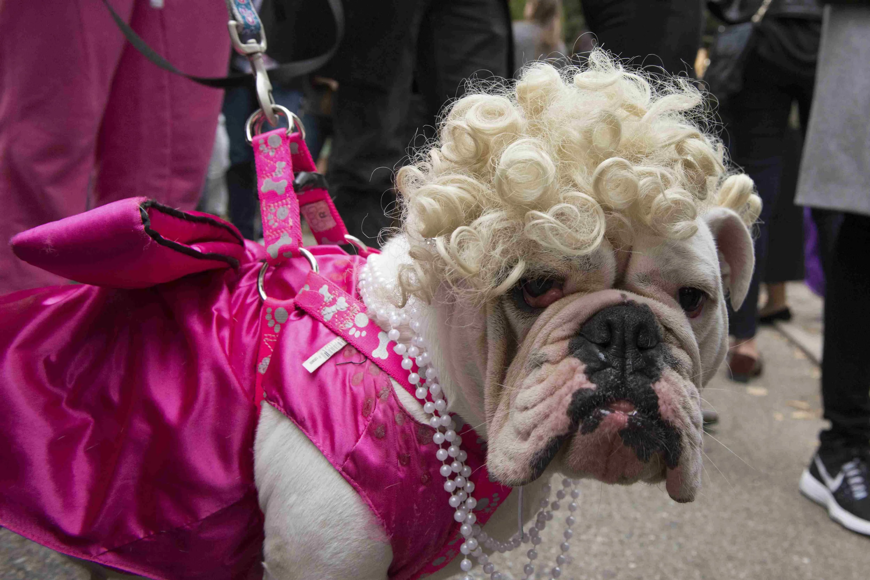 A bulldog dressed as Marilyn Monroe poses for a photograph during the annual Tompkins Square Halloween Dog Parade in the Manhattan borough of New York City, October 24, 2015. (Photo by Stephanie Keith/Reuters)