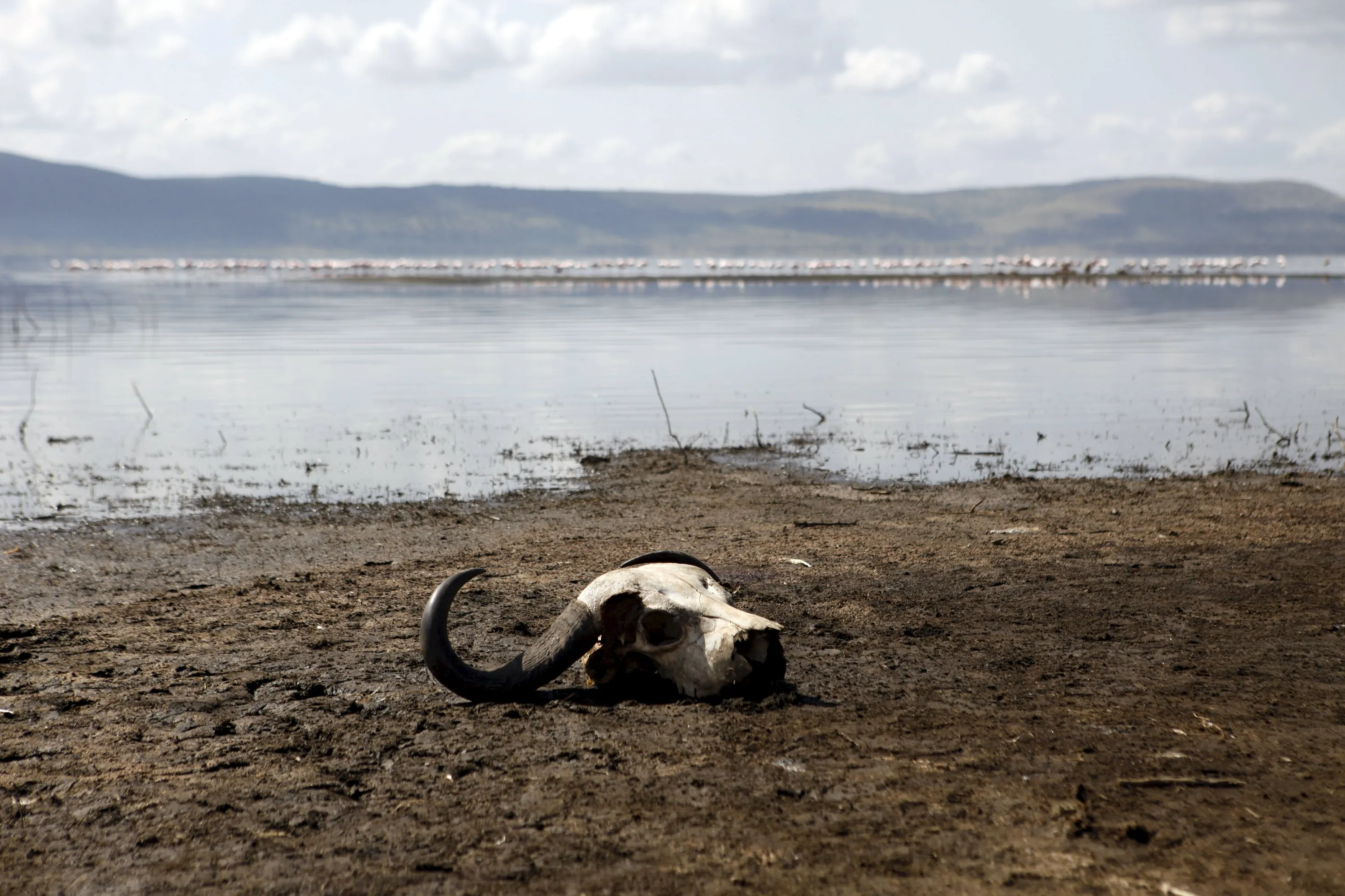 A buffalo skull is seen next to the water at Lake Nakuru National Park, Kenya, August 19, 2015. (Photo by Joe Penney/Reuters)