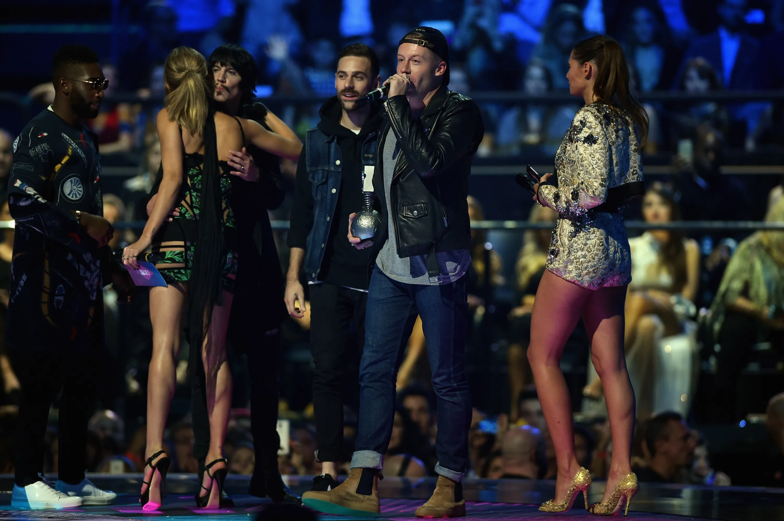 (L-R) Eric Nally (3rd-L), Ryan Lewis (3rd-R) and Macklemore (2nd-R) accept the award for Best Video for ''Downtown'' from Bianca Balti (R), Tinie Tempah (L) and Hailey Baldwin (2nd-L) on stage during the MTV EMA's 2015 at the Mediolanum Forum on October 25, 2015 in Milan, Italy. (Photo by Brian Rasic/Getty Images for MTV)