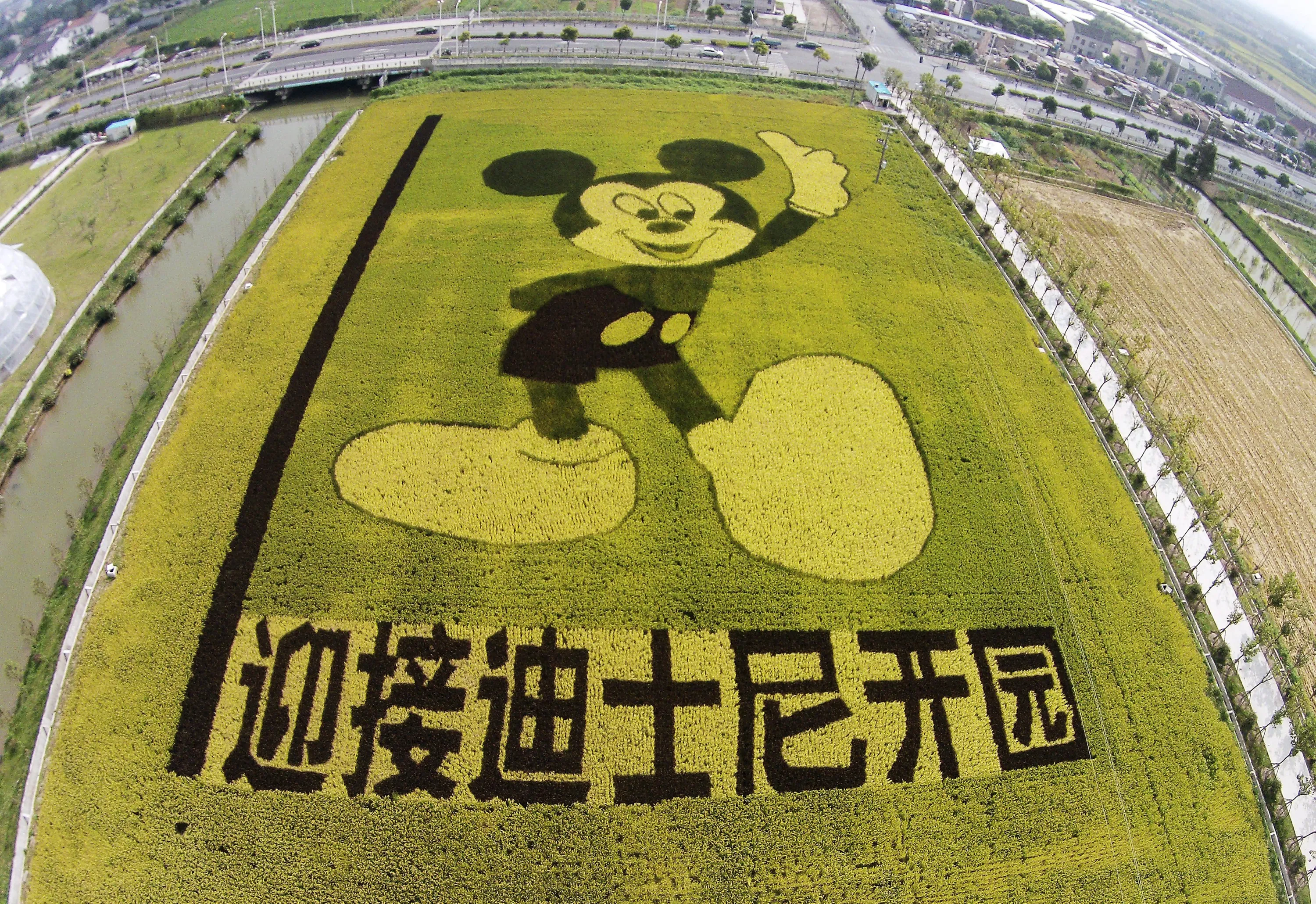 An aerial view shows rice plants in the shape of Mickey Mouse on a paddy field to celebrate the Shanghai Disney Resort which will be opened in 2016, in Shanghai, China, October 24, 2015. The Chinese characters on the bottom read, "Welcome Disney Resort's Opening". (Photo by Reuters/China Daily)
