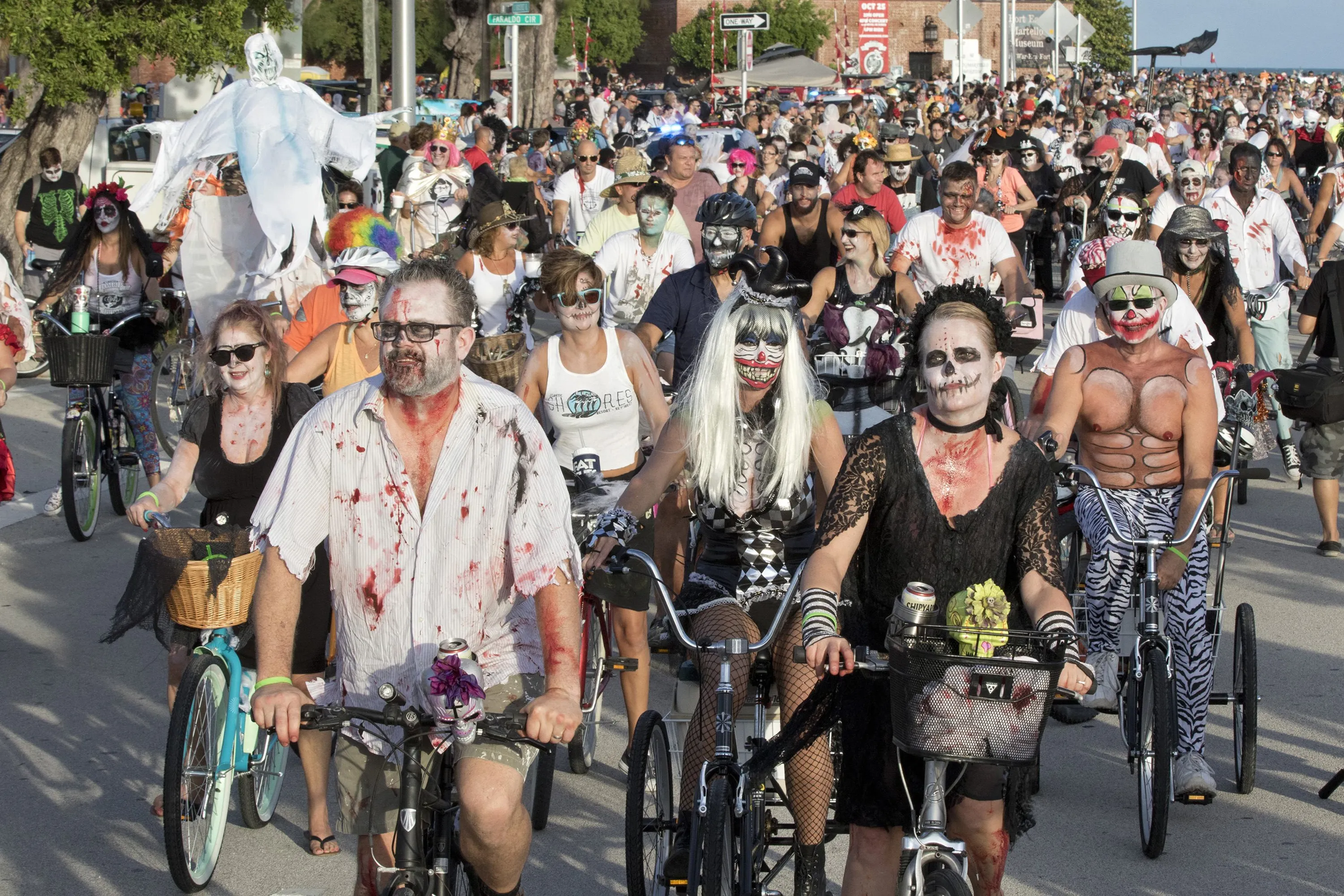 Costumed participants in the Zombie Bike Ride pedal down South Roosevelt Boulevard in Key West, Florida, October 25, 2015. More than 8,500 "zombies" cycled for more than four miles during the event that coincided with the beginning weekend of Key West's annual 10-day Fantasy Fest costuming and masking celebration that continues through November 1st. (Photo by Rob O'Neal/Reuters/Florida Keys News Bureau)