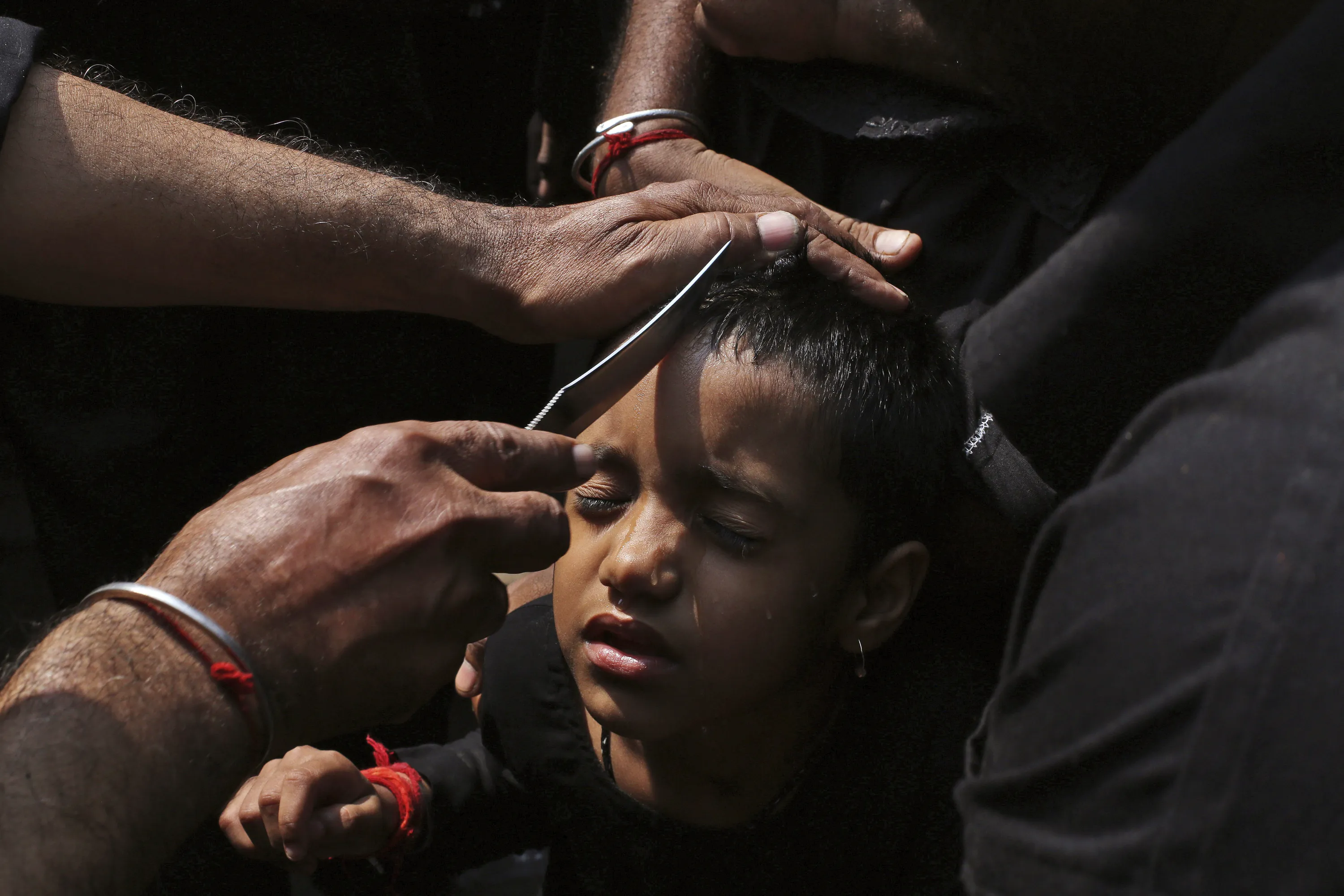 An Indian Shiite Muslim man prepares to make a cut on the forehead of a child with a knife during a procession to mark Ashoura in Hyderabad, India, Saturday, October 24, 2015. Ashoura is the 10th day of Muharram, the first month of the Islamic calendar, observed around the world in remembrance of the martyrdom of Imam Hussein, the grandson of Prophet Mohammed. (Photo by Mahesh Kumar A./AP Photo)