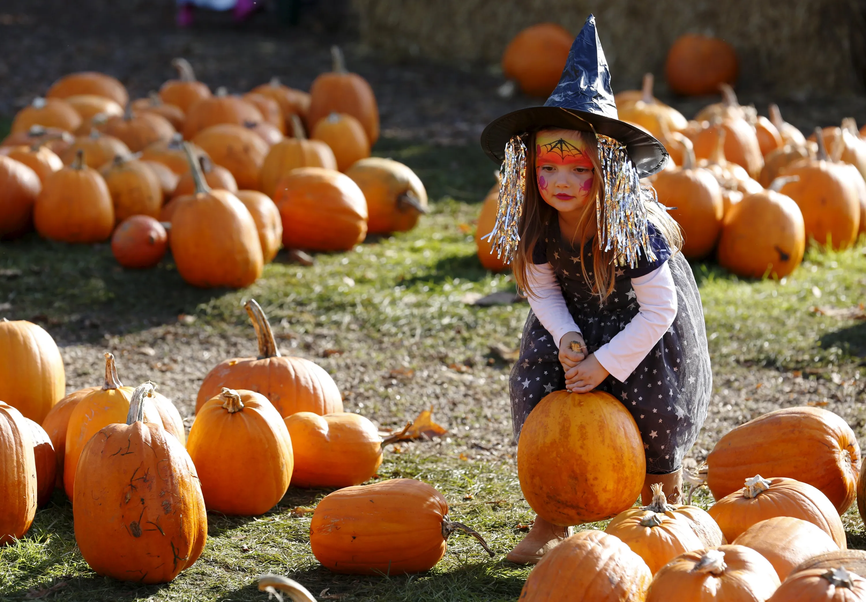 Dressed as a witch, Maisy Thompson plays with pumpkins in the pumpkin patch, ahead of Halloween at Crockford Bridge Farm at Addlestone near Woking, southern Britain October 26, 2015. (Photo by Luke MacGregor/Reuters)