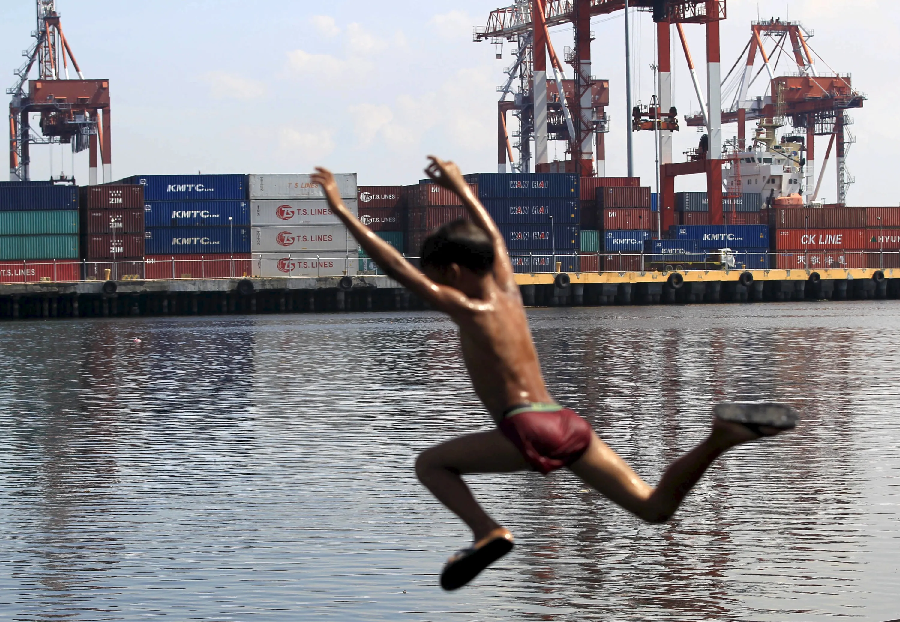 Stacks of containers are seen while a boy dives on a river near a port in the capital Manila October 9, 2015. (Photo by Romeo Ranoco/Reuters)
