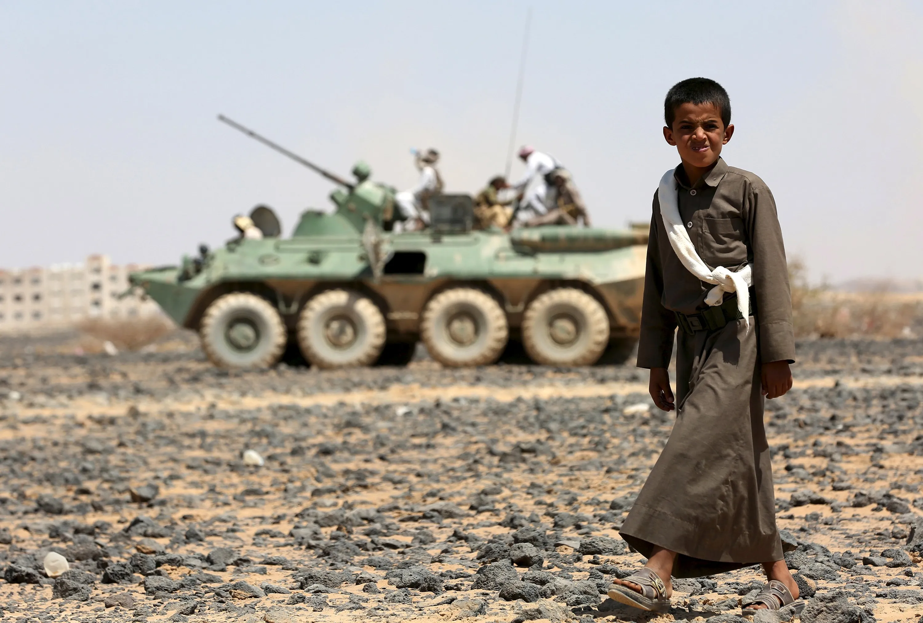 A boy walks in front of fighters of the Popular Resistance Committees riding on an armoured vehicle during a ceremony where they formally take over territory that the government had managed to recover from Houthi militants, in the central province of Marib October 11, 2015. (Photo by Reuters/Stringer)