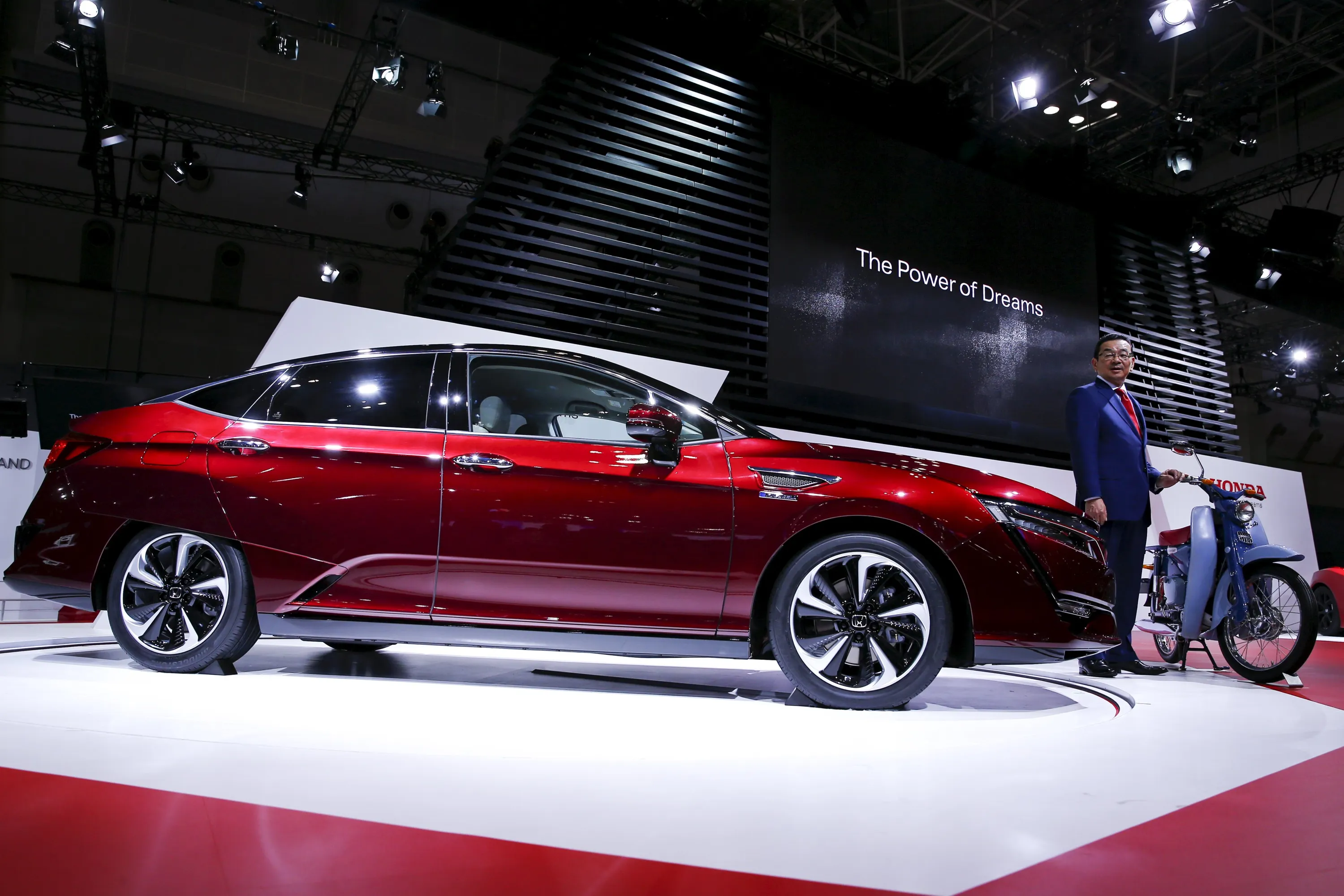 Honda Motor Co President and CEO Takahiro Hachigo poses between the FCV Clarity Fuel Cell car (L) and the Super Cub Concept moped after their presentation at the 44th Tokyo Motor Show in Tokyo, Japan, October 28, 2015. Honda Motor Co is confident it can achieve its 2015 sales target of 950,000 cars in China, but is cautious about increasing production in the world's No.2 economy given the uncertain economic outlook, Hachigo told Reuters. (Photo by Thomas Peter/Reuters)