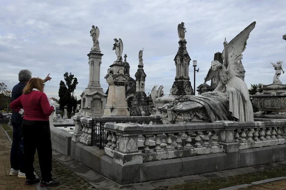 A couple watches the pantheon of the Marquesa de San Juan de Nieva, chosen as the best tomb sculpture of Spain in a Spanish magazine this week, in the municipal cemetery of La Carriona in Aviles, northern Spain, October 29, 2015. (Photo by Eloy Alonso/Reuters)