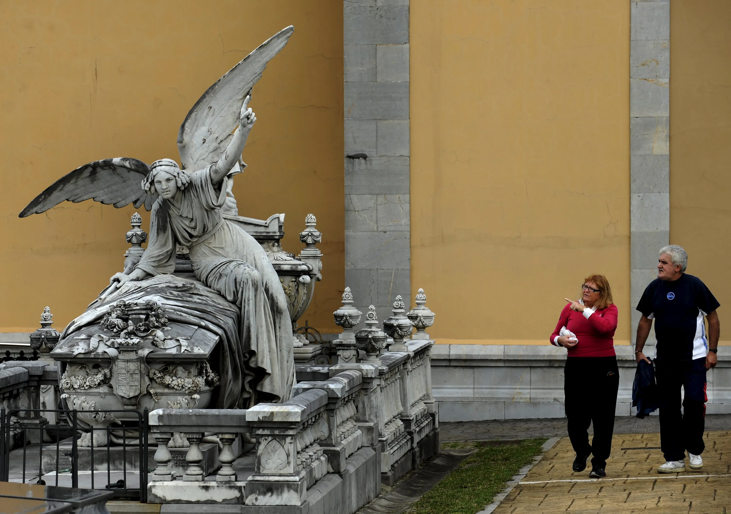 A couple walking near the pantheon of the Marquesa de San Juan de Nieva, chosen as the best tomb sculpture of Spain in a Spanish magazine this week, in the municipal cemetery of La Carriona in Aviles, northern Spain, October 29, 2015. (Photo by Eloy Alonso/Reuters)
