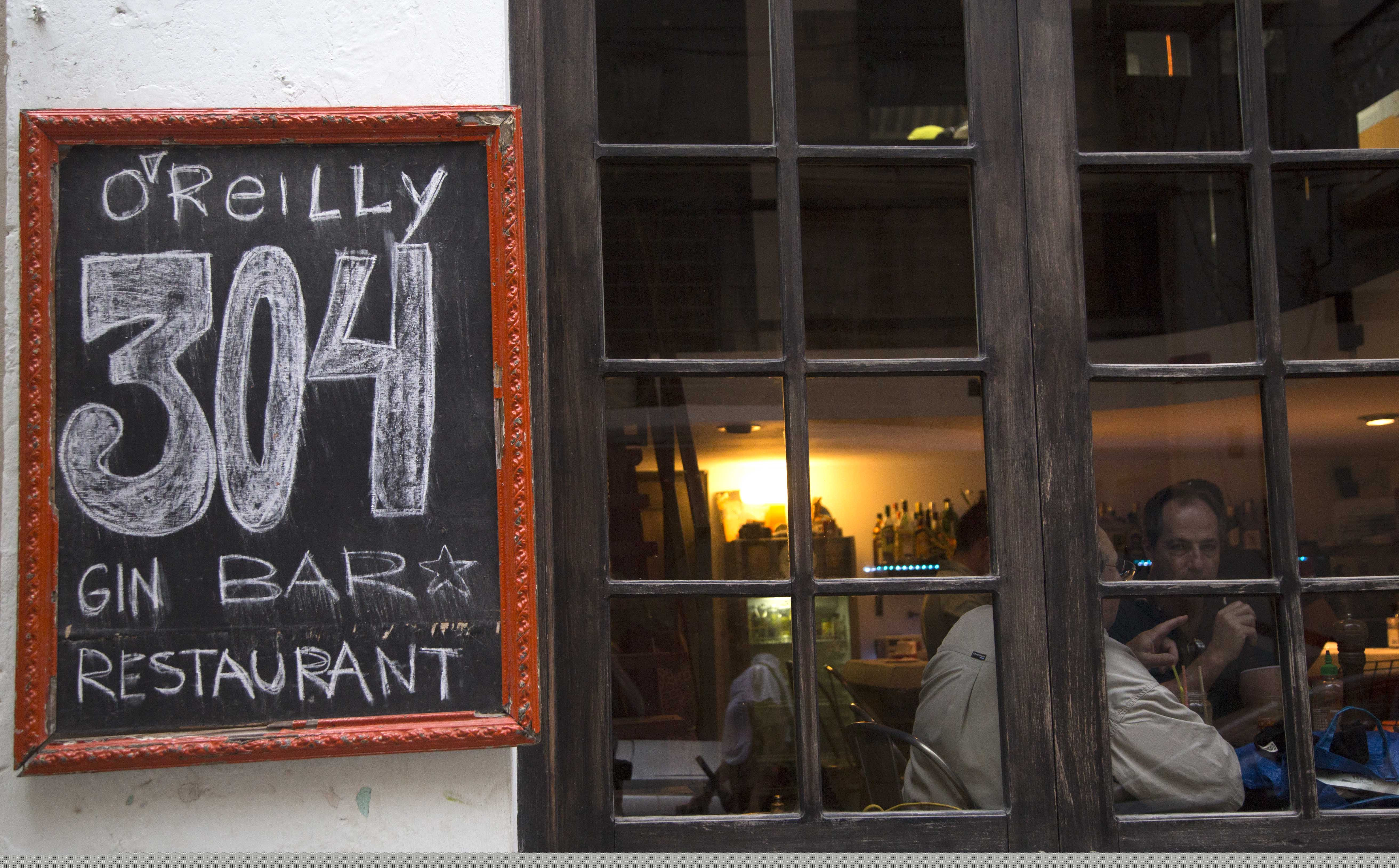 Tourists sit in the popular O'Reilly 304 Bar in Old Havana, Cuba, Tuesday, October 13, 2015. Tour companies showing the Americans around Cuba have sprouted investment consulting arms. Cubans with money and foreign backers are furiously rehabbing old homes into micro-hotels complete with high-end restaurants and conference rooms for business meetings. (Photo by Desmond Boylan/AP Photo)
