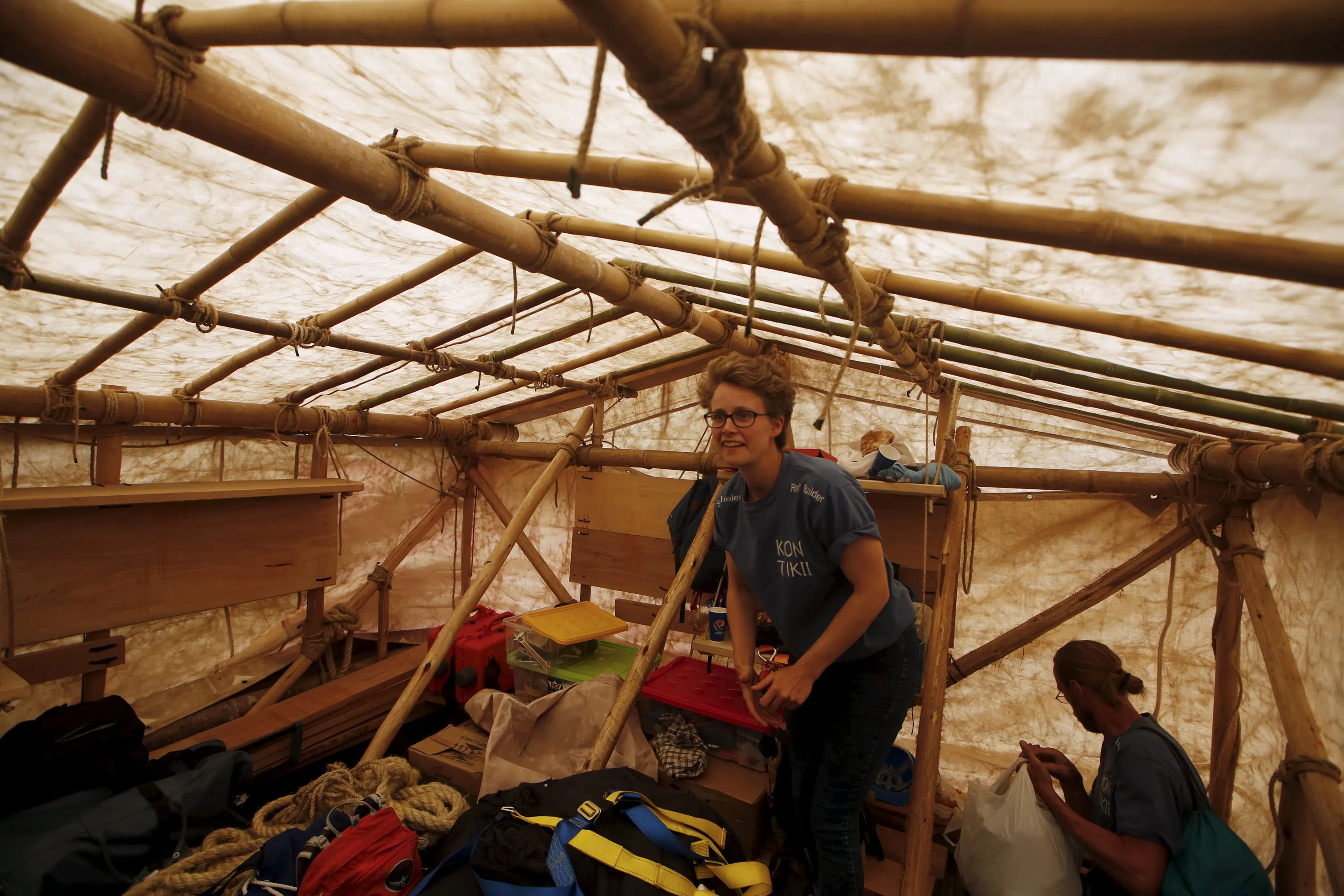 Crew members of the Kon-Tiki II expedition check out the cockpit of one of the two wooden rafts at the port of Callao prior to the departure to Pascua island in Chile, in Callao, Peru, October 30, 2015. (Photo by Mariana Bazo/Reuters)