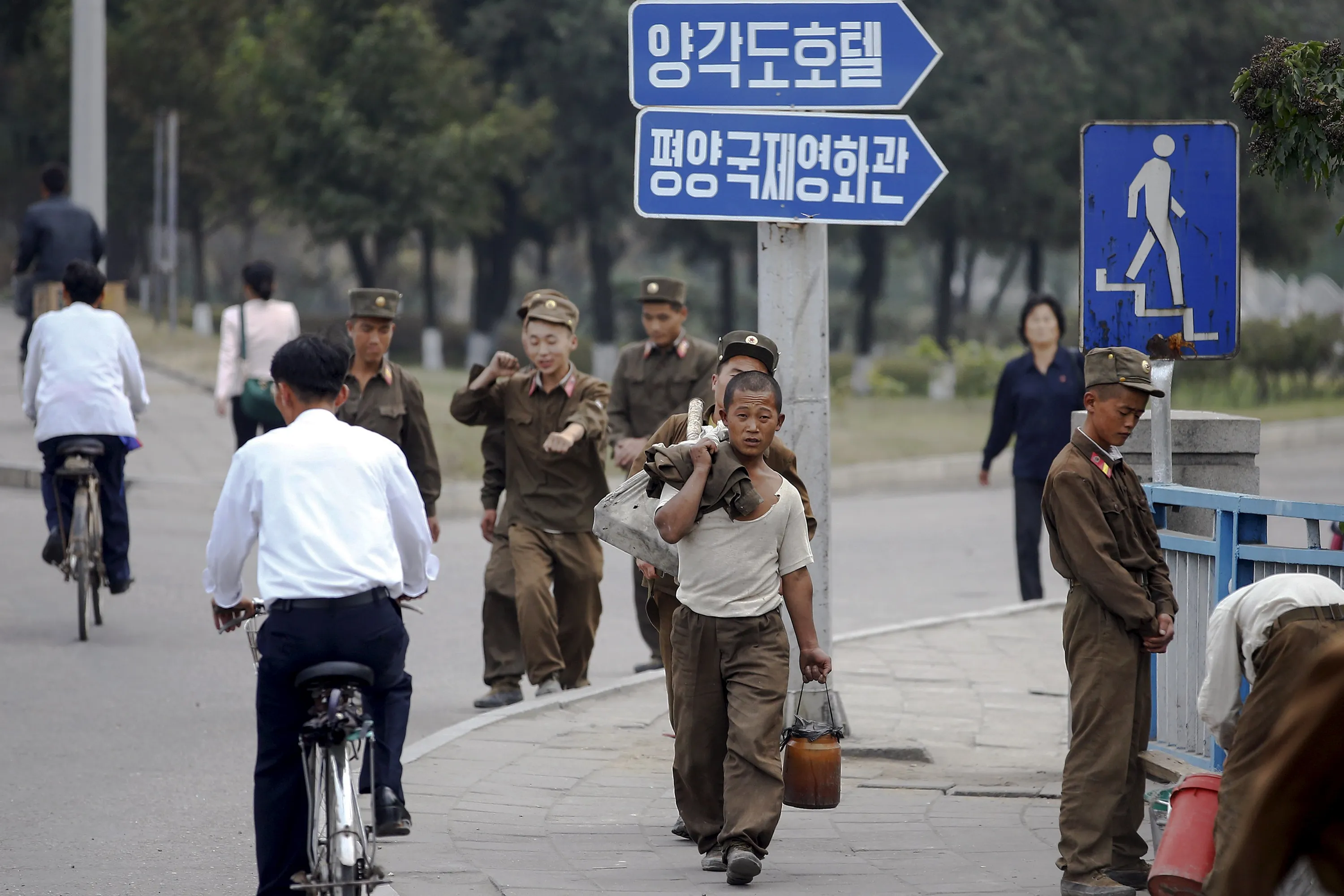 "Soldier-builders" carry things in central Pyongyang October 8, 2015. (Photo by Damir Sagolj/Reuters)