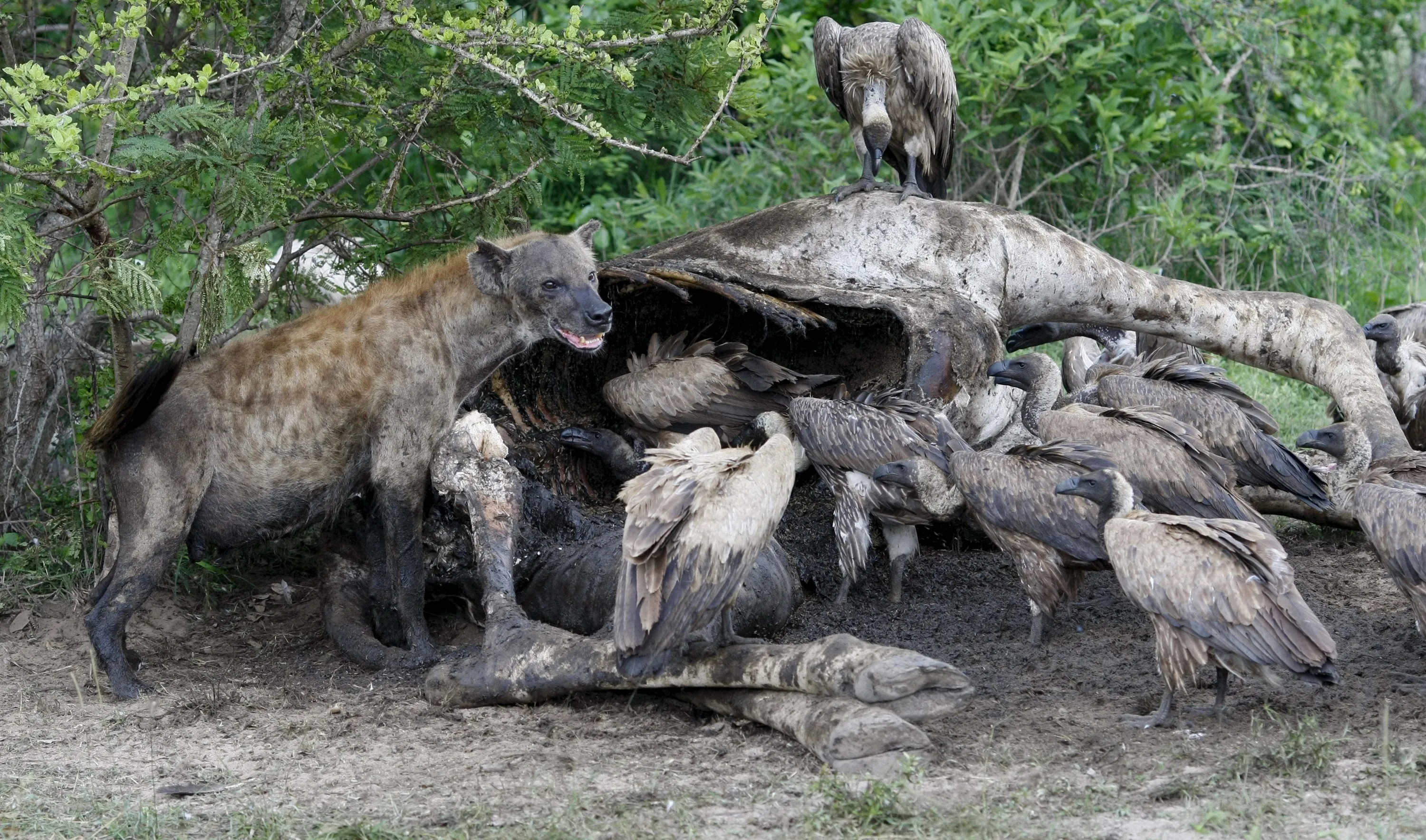 A hyena and a group of vultures feed on the carcass of a giraffe killed by lions in South Africa's Kruger National Park, in this December 14, 2009 file picture. Africa's vultures are in serious decline, according to a report released on October 29, 2015, a situation that could impact human health and livestock as populations of other scavengers such as rats and jackals could rise as a result. The assessment, carried out by conservation group BirdLife International, found that six of Africa's 11 vulture species were at risk of extinction. (Photo by Mike Hutchings/Reuters)