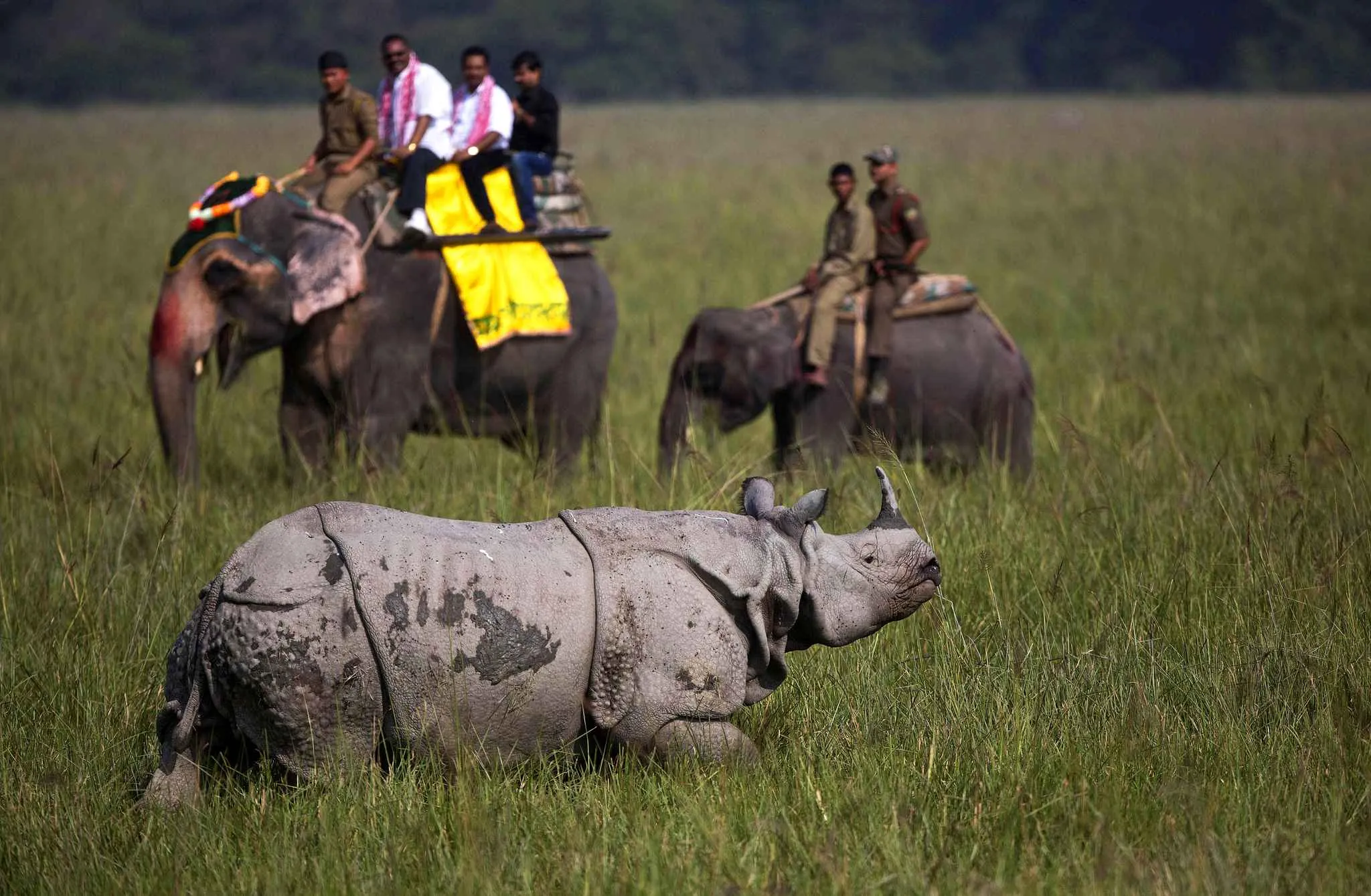Tourists look at an Indian one-horned rhinoceros at the Pobitora Wildlife Sanctuary, some 55 kilometers east of Gauhati, India, Saturday, October 31, 2015. The sanctuary, which is known for the Indian one-horned rhino population, reopened for tourists Saturday. The sanctuary closes annually during the rainy season. (Photo by Anupam Nath/AP Photo)