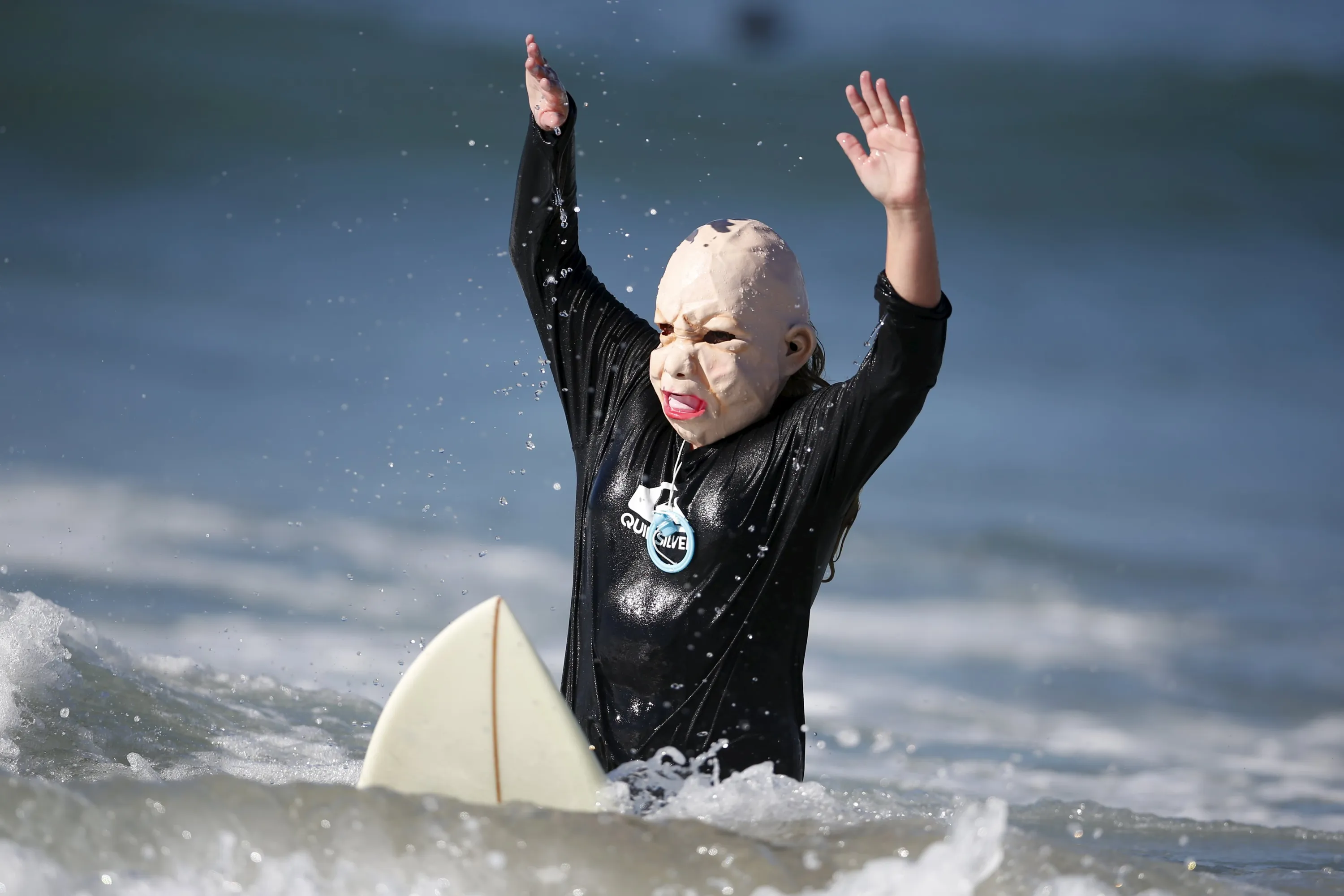 Joey Callhehan, 13, competes dressed as a baby during the ZJ Boarding House Haunted Heats Halloween Surf Contest in Santa Monica, California, United States, October 31, 2015. (Photo by Lucy Nicholson/Reuters)