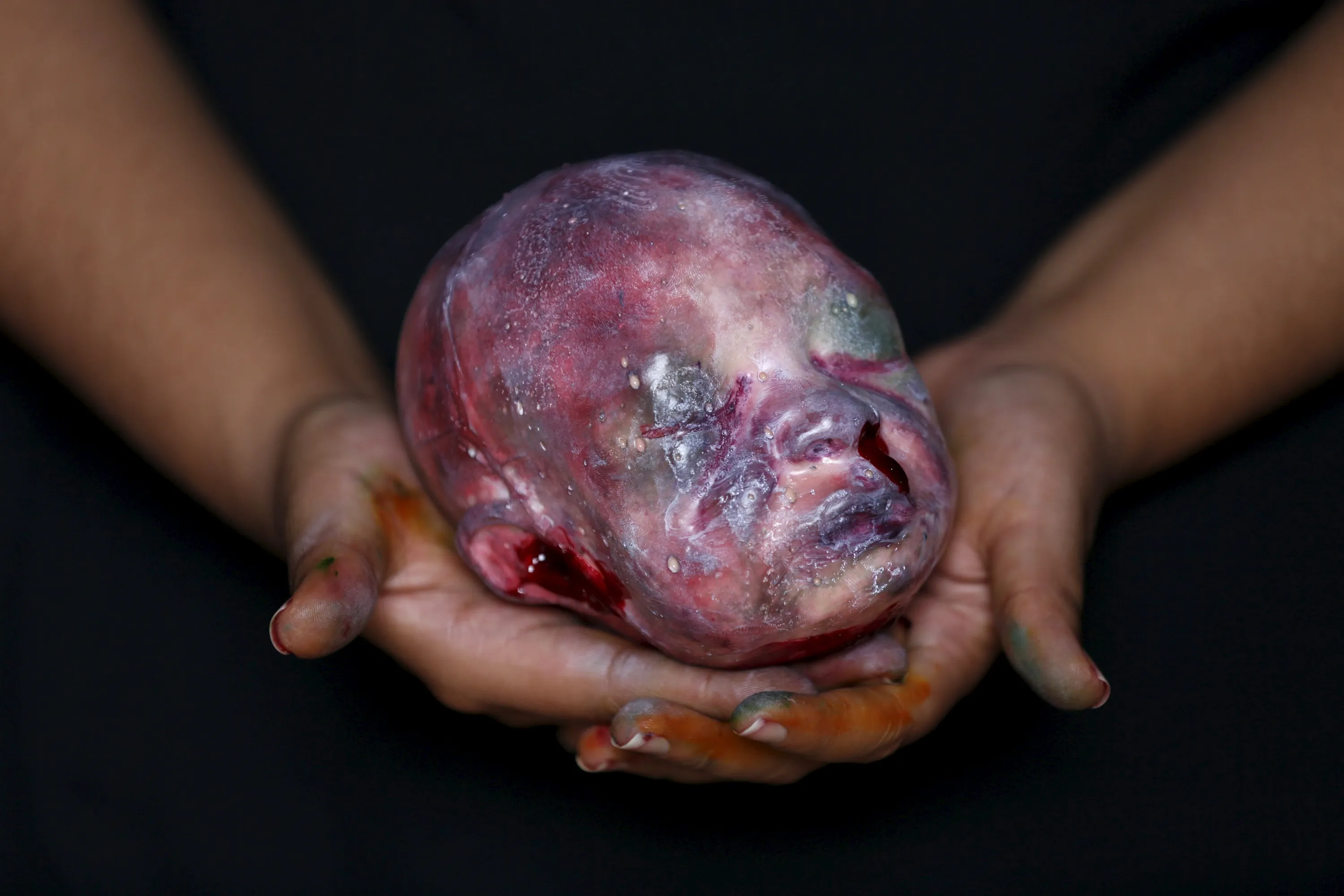 A bloody zombie baby head made of gummy candy and red jelly is pictured at the Zombie Gourmet homemade candy manufacturer on the outskirts of Mexico City October 30, 2015. (Photo by Carlos Jasso/Reuters)