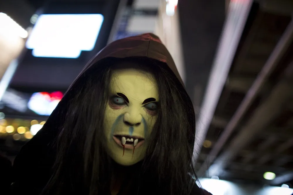 A reveller wearing a mask poses for pictures during Halloween celebrations in the Shibuya district in Tokyo, Japan October 31, 2015. (Photo by Thomas Peter/Reuters)