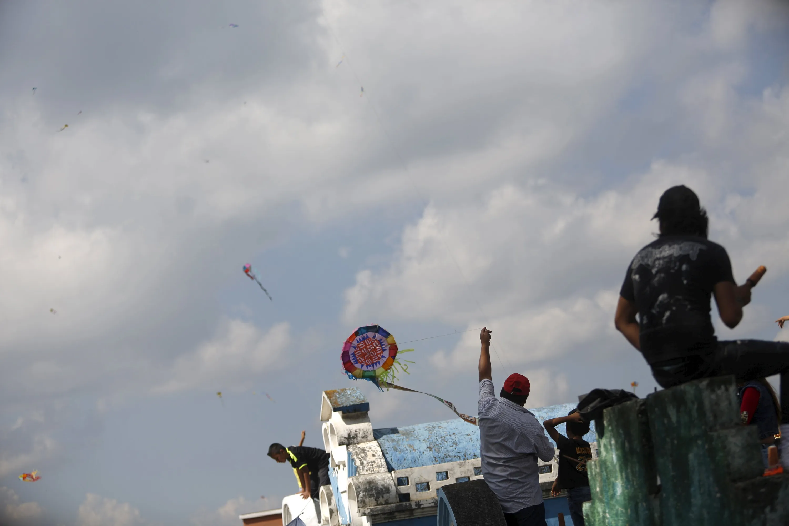 Men fly kites over graves in the cemetery of Santiago Sacatepequez, Guatemala, November 1, 2015. Dating back 116 years, the tradition of flying kites in the cemetery of of Santiago Sacatepequez, integrates the Catholic feast of All Saints with ancient Mayan practices of honouring the dead. It is believed that the kites connect the living and the dead during the all saints day celebration. (Photo by Jorge Dan Lopez/Reuters)