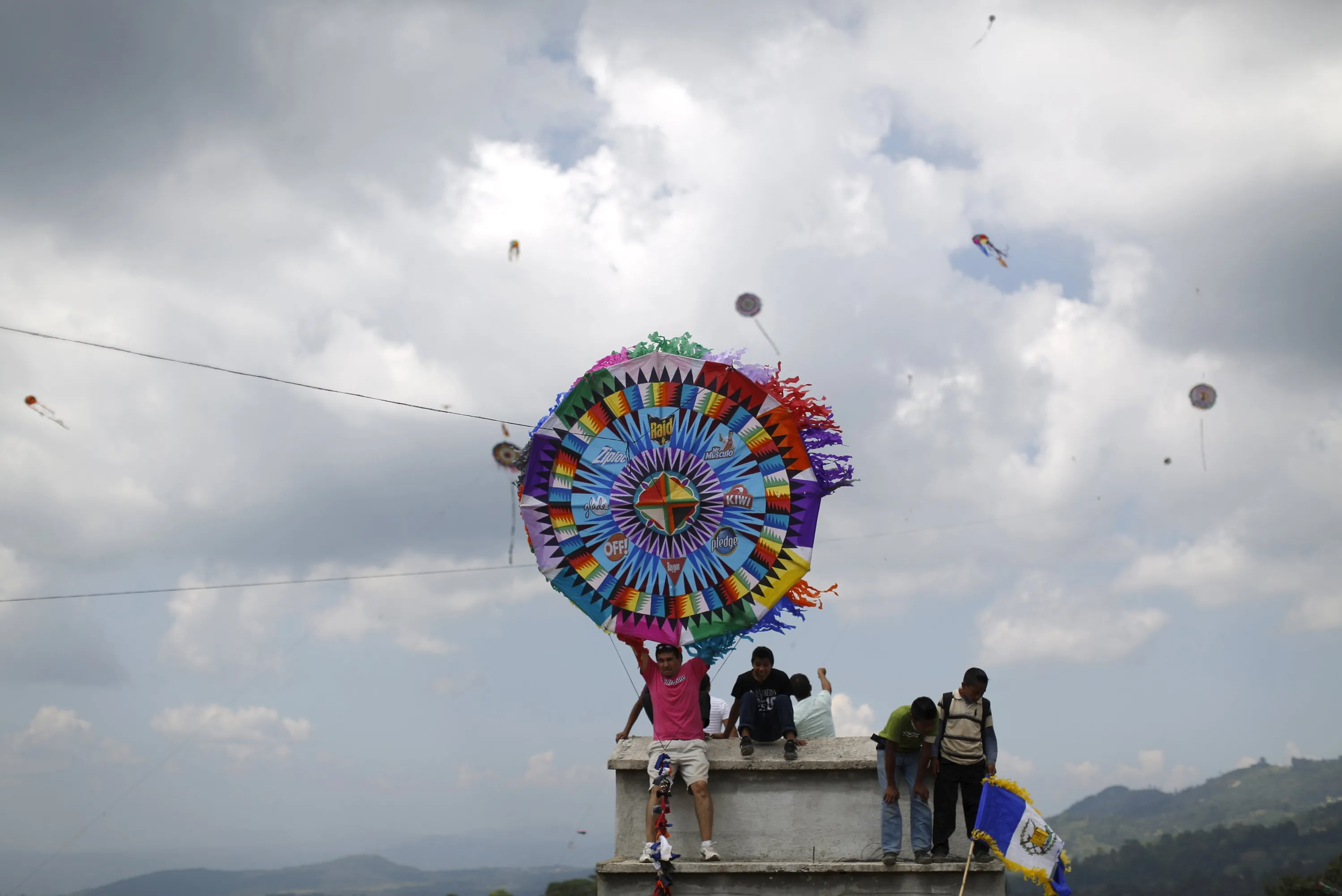 A man holds a kite over a grave before flying it in the cemetery of Santiago Sacatepequez, Guatemala, November 1, 2015. (Photo by Jorge Dan Lopez/Reuters)