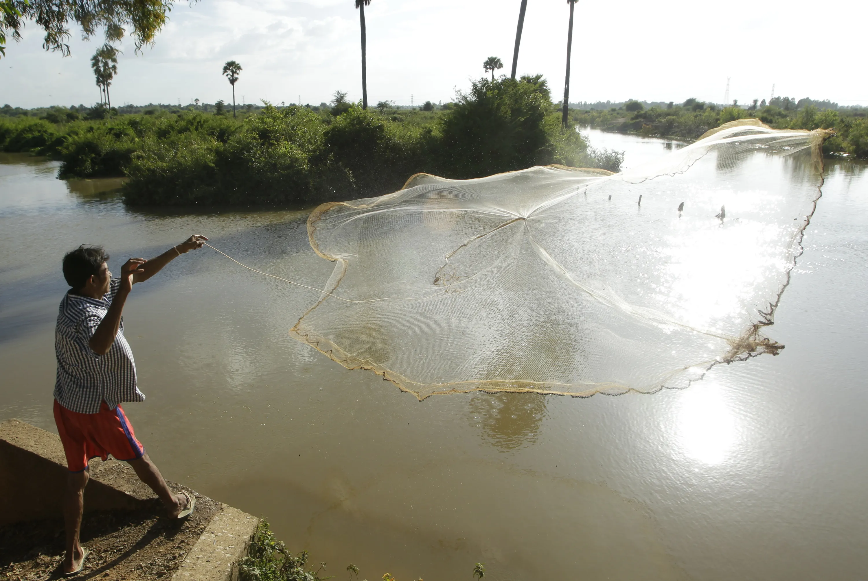 A Cambodian man casts his net for catching fish for his family food on downstream at Tuol village on the outskirt of Phnom Penh, Cambodia, Monday, November 2, 2015. (Photo by Heng Sinith/AP Photo)