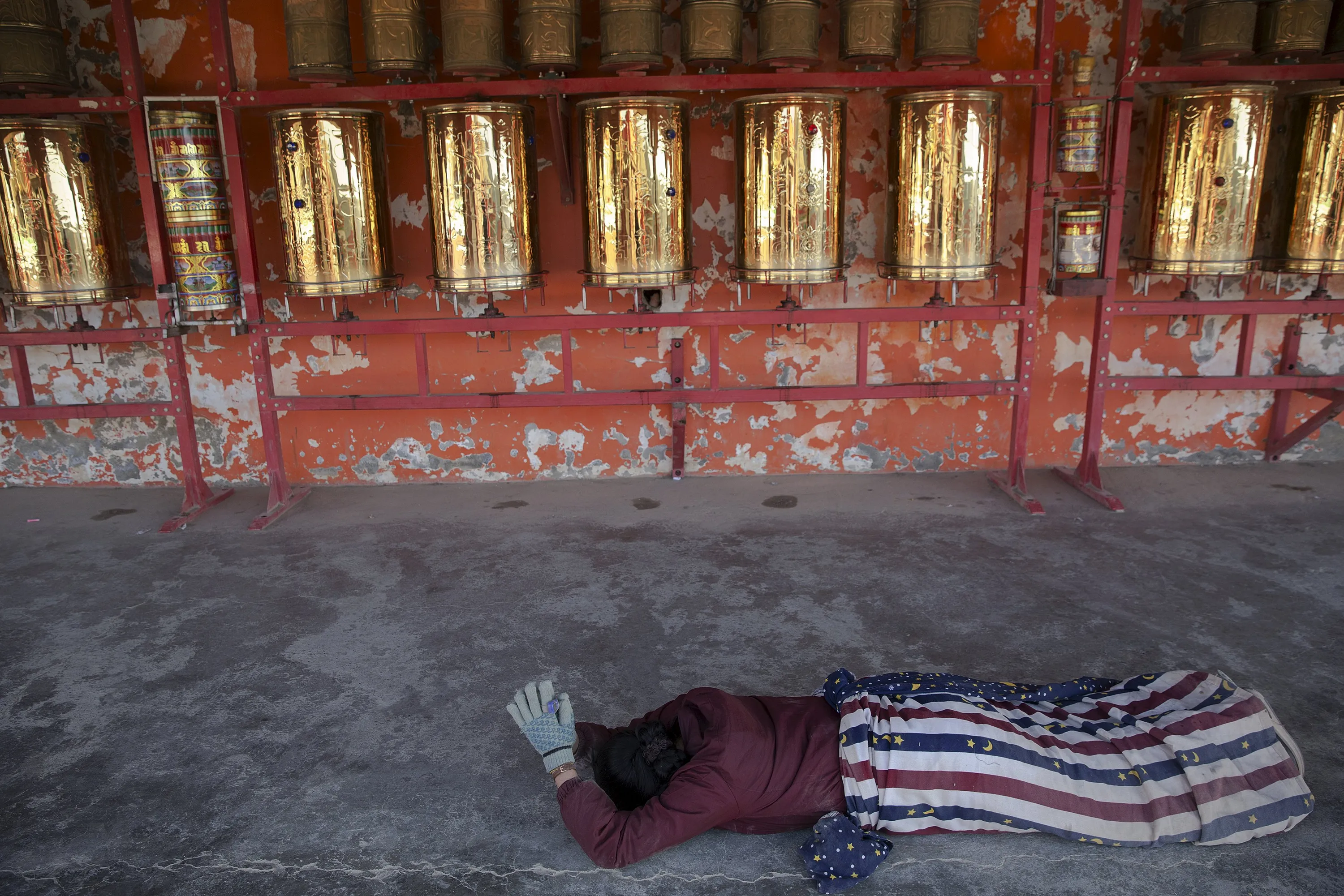 An ethnic Tibetan woman prostrates herself in front of prayer wheels as she circles around a monastery above the Larung Wuming Buddhist Institute, located some 3700 to 4000 metres above the sea level, in remote Sertar county, Garze Tibetan Autonomous Prefecture, Sichuan province, China November 1, 2015. (Photo by Damir Sagolj/Reuters)