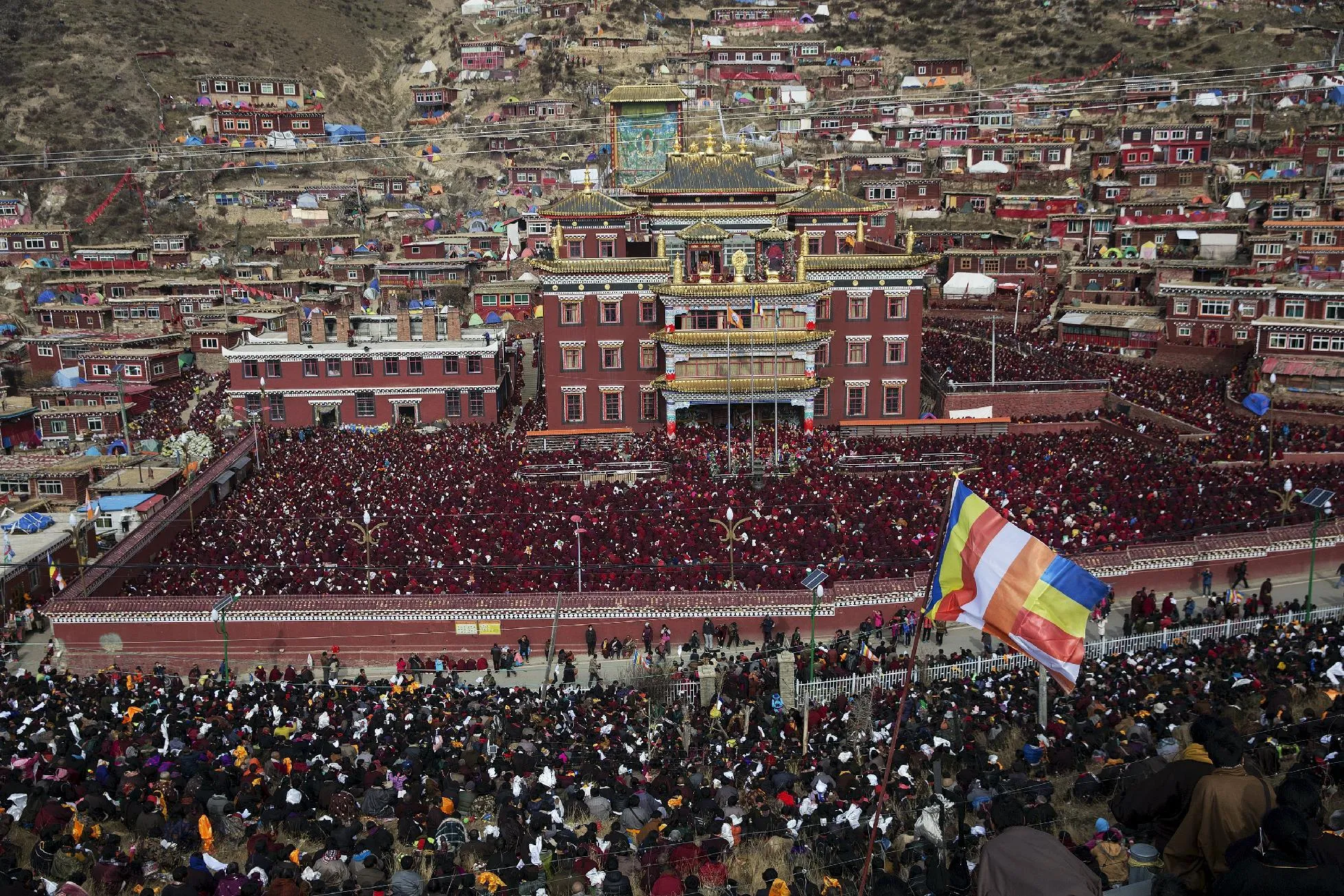 Thousands of monks, nuns and believers gather at a Buddhist laymen lodge attending a daily chanting session during the Utmost Bliss Dharma Assembly, the last of the four Dharma assemblies at Larung Wuming Buddhist Institute in remote Sertar county, Garze Tibetan Autonomous Prefecture, Sichuan province, China early October 30, 2015. (Photo by Damir Sagolj/Reuters)