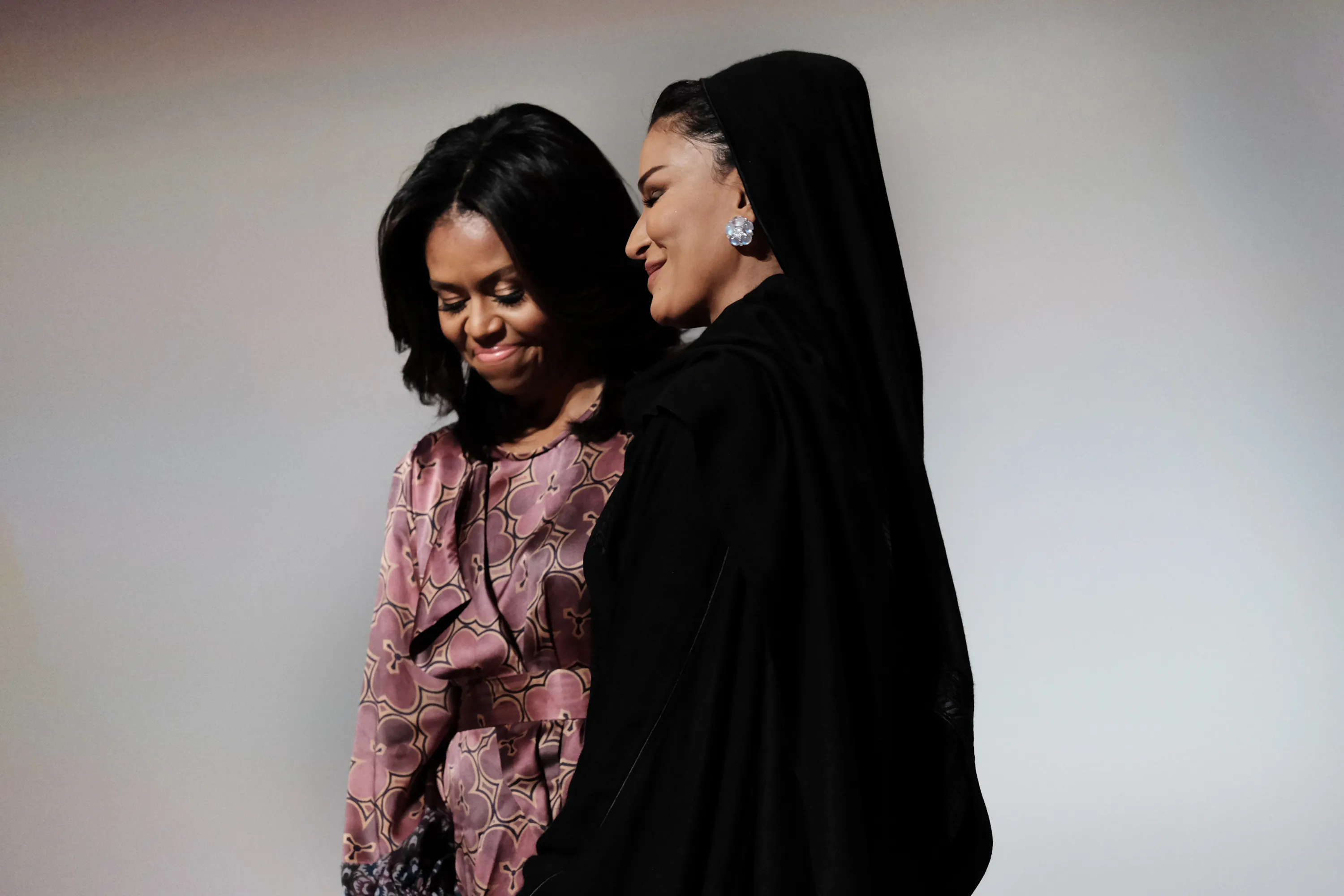 First lady Michelle Obama and Moza bint Nasser, one of the wives of the former emir of Qatar, stand onstage during the World Innovation Summit for Education in Doha on November 4, 2015, where they spoke on the importance of educating girls. (Photo by Bonnie Jo Mount/The Washington Post)