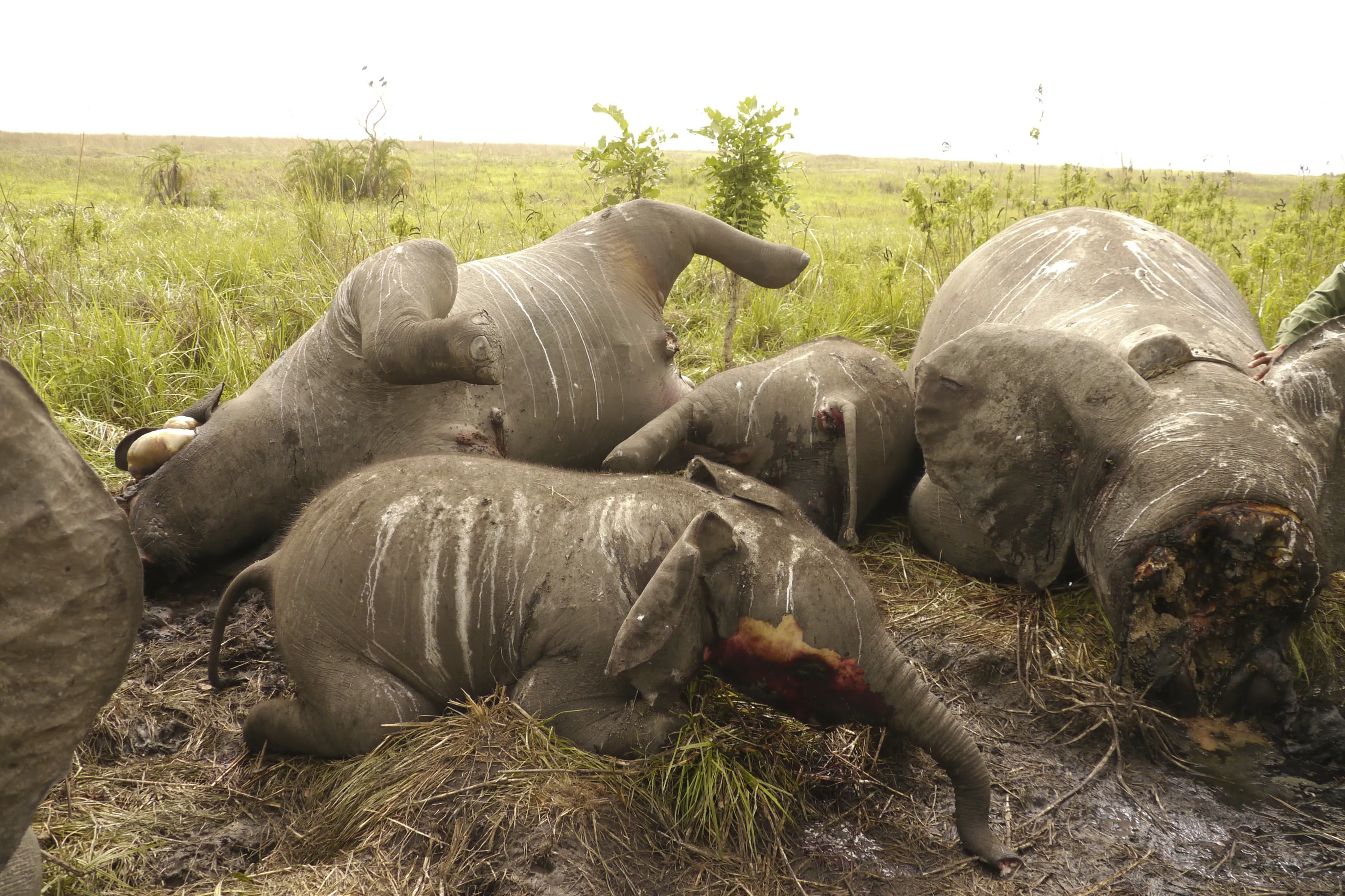 The carcasses of some of the 22 elephants slaughtered in a helicopter-bourne attack lie on the ground in the Democratic Republic of Congo's Garamba National Park, in this undated handout picture released by the DRC Military. (Photo by Reuters/DRC Military)