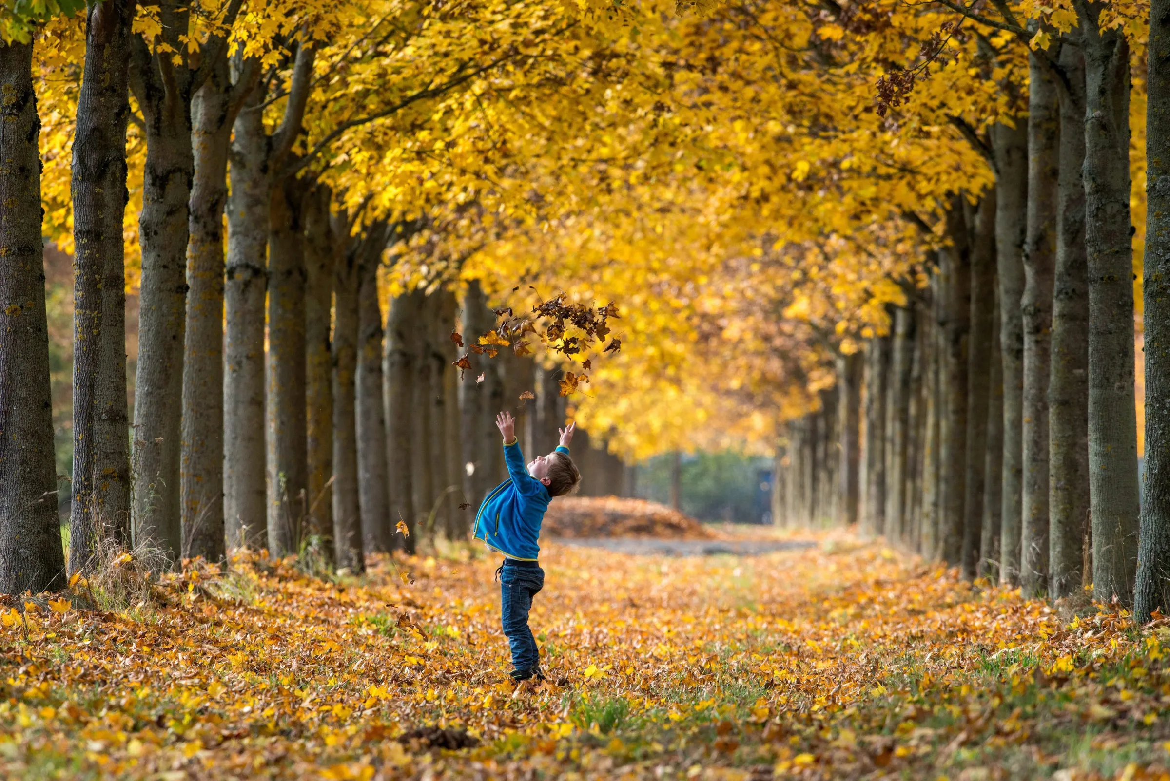 A photograph made avaialble on 24 October 2015 showing a young boy playing amongst the autumn leaves in a tree lined avenue in Straubing, southern Germany 23 October 2015. (Photo by Armin Weigel/EPA)
