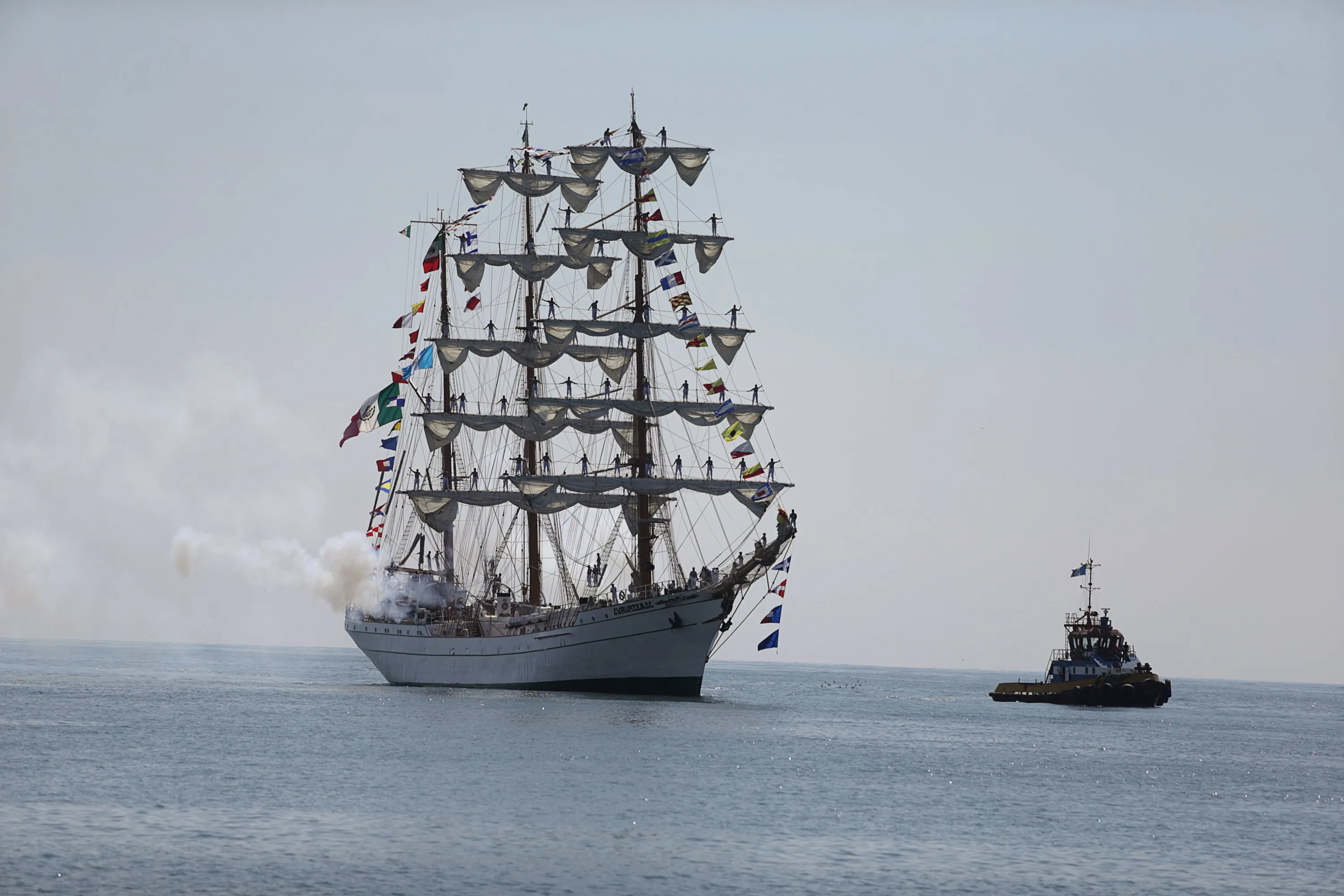 Mexico's naval training ship ARM Cuauhtemoc fires a cannon during its arrival at Puerto Quetzal, Guatemala, November 4, 2015. The training ship arrived at Guatemala from Nicaragua following seven months out at sea, according to the Mexican embassy in Guatemala. (Photo by Jorge Dan Lopez/Reuters)