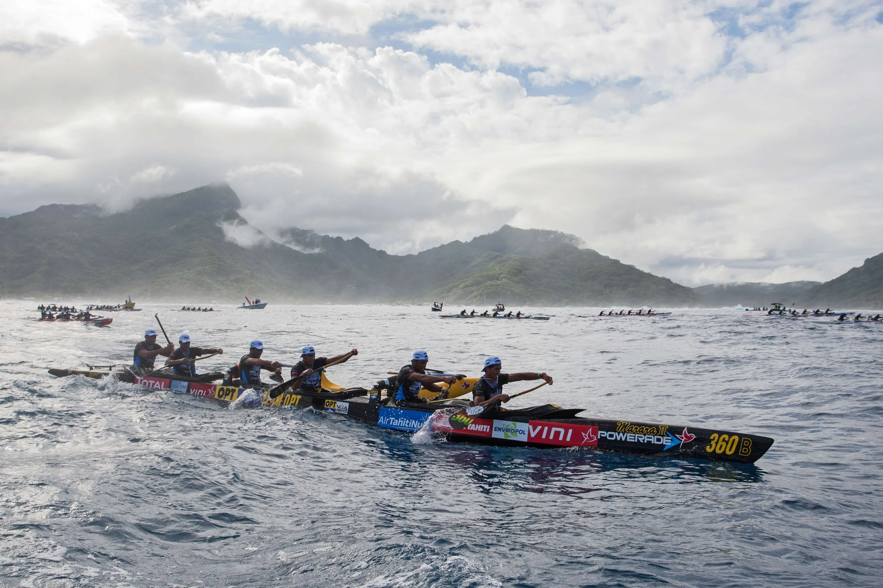 Participants exit the Huahine pass in the direction of Raiatea on the morning of November 4, 2015 for the first leg of the Hawaiki Nui Va'a 2015 outrigger canoe race. The Hawaiki Nui Va'a outrigger canoe race is an annual event with more than 100 team of intense racing between Huahine, Raiatea, Taha'a and Bora Bora, honoring an ancient sport with great cultural values. The 24th edition of the race hosts teams from Taihiti, France and New Zealand, with the number of teams and countries increasing each year. Originally made in wood, almost all of the canoes are today fabricated with high tech polyester material and carbon fiber. (Photo by Gregory Boissy/AFP Photo)