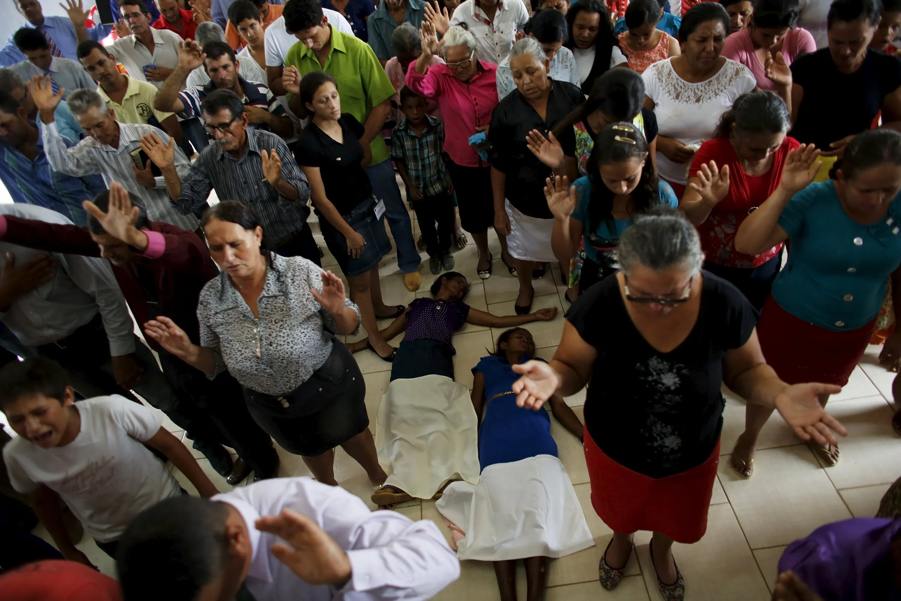 People pray during a mass in an evangelical church in the village of Rio Pardo next to Bom Futuro National Forest, in the district of Porto Velho, Rondonia State, Brazil, August 30, 2015. (Photo by Nacho Doce/Reuters)