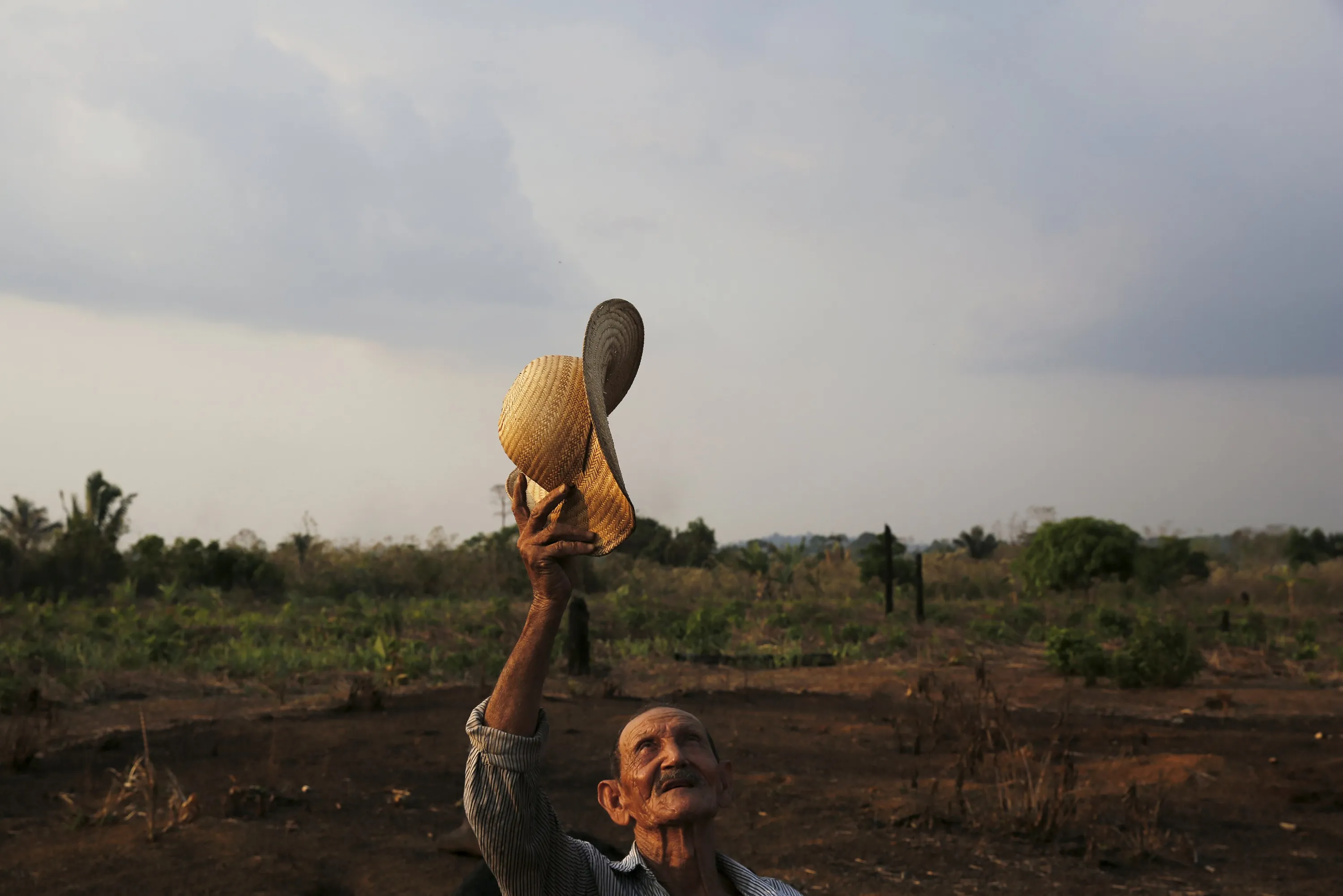 Zezito Oliveira, 83, gestures with his hat, thanking God for his life and his land, on his farm in Rio Pardo next to Bom Futuro National Forest, Rondonia State, Brazil, September 1, 2015. (Photo by Nacho Doce/Reuters)