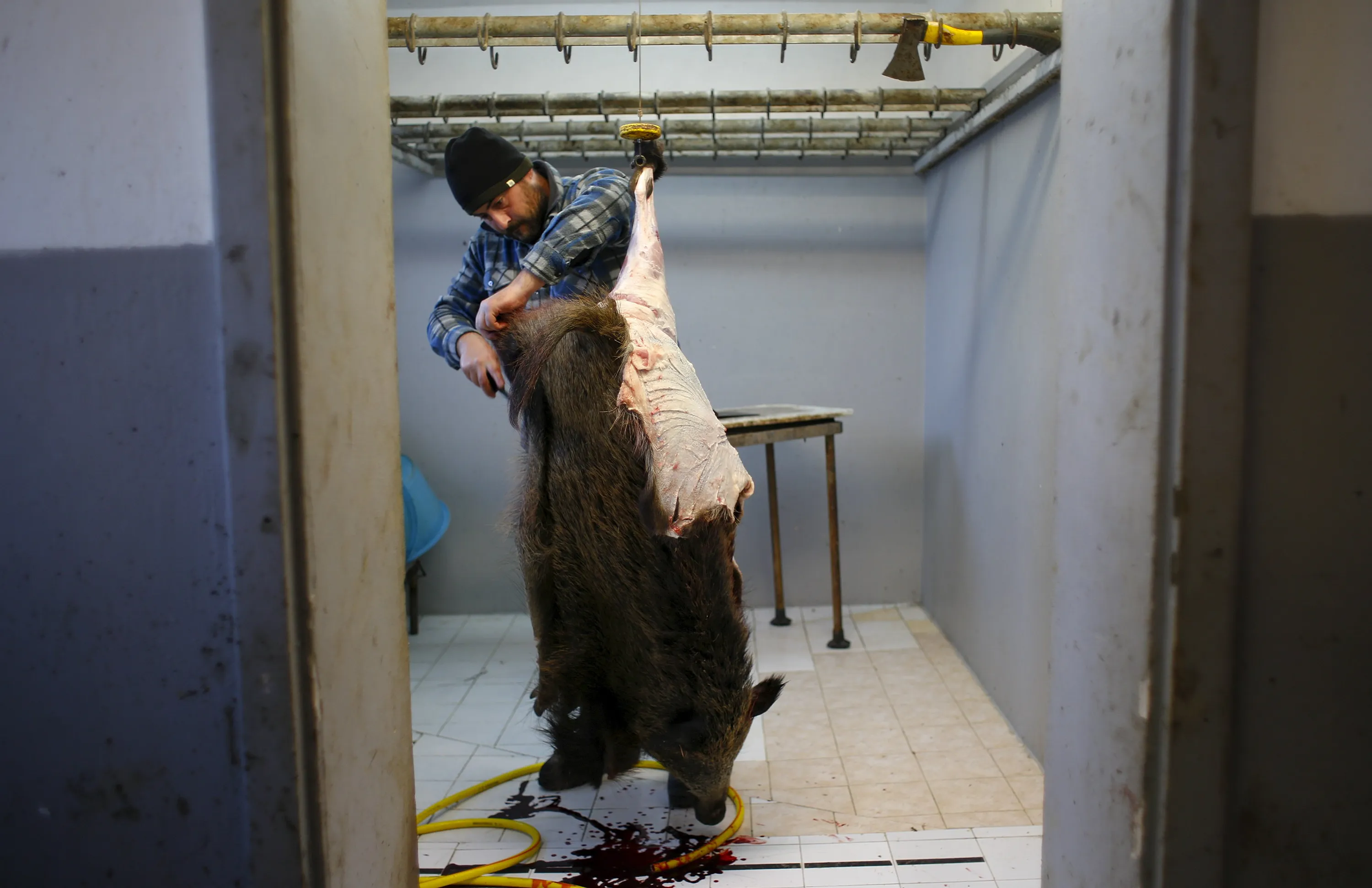 Lorenzo Tello skins a dead wild boar at the end of a hunt in Castell'Azzara, Tuscany, central Italy, October 23, 2015. (Photo by Max Rossi/Reuters)