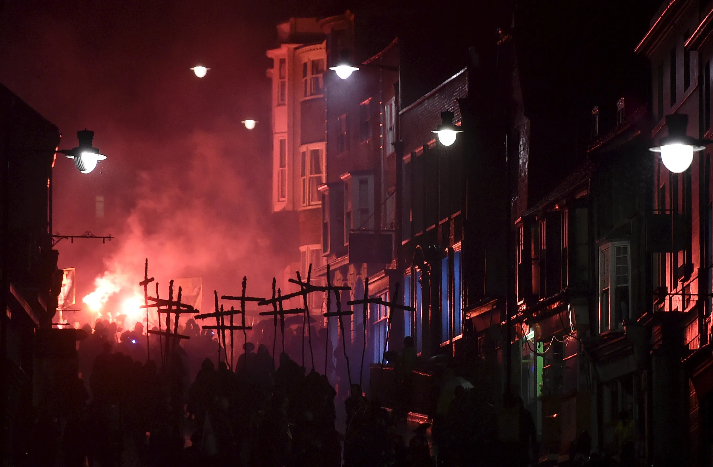 Participants in costume hold burning torches and crosses as they take part in one of a series of processions during Bonfire night celebrations in Lewes, southern England November 5, 2015. The processions and bonfire mark the uncovering of Guy Fawkes' "Gunpowder Plot" to blow up the Houses of Parliament in 1605, and commemorates the memory of Lewes' seventeen Protestant martyrs. (Photo by Toby Melville/Reuters)
